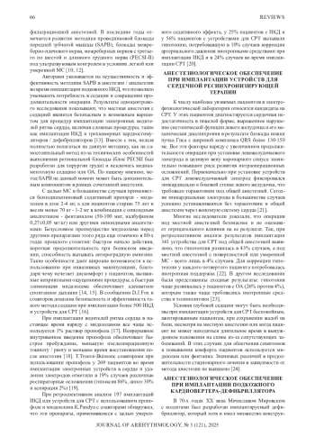 В статье представлены современные методы анестезиологического пособия, используемые в ходе выполнения таких интервенционных и хирургических вмешательств как имплантация кардиостимуляторов, устройств сердечной ресинхронизирующей терапии, кардиовертеров-дефибрилляторов и проведения катетерной аблации. Обсуждаются преимущества, недостатки и проблемные вопросы анестезии в зависимости от типа вмешательства и состояния пациента. На основании проанализированных данных делается вывод о том, что анестезия в ходе вмешательств у пациентов аритмологического профиля является общемировой практикой и подчеркивается положительное влияние методов анестезии на качество и безопасность выполняемых процедур.