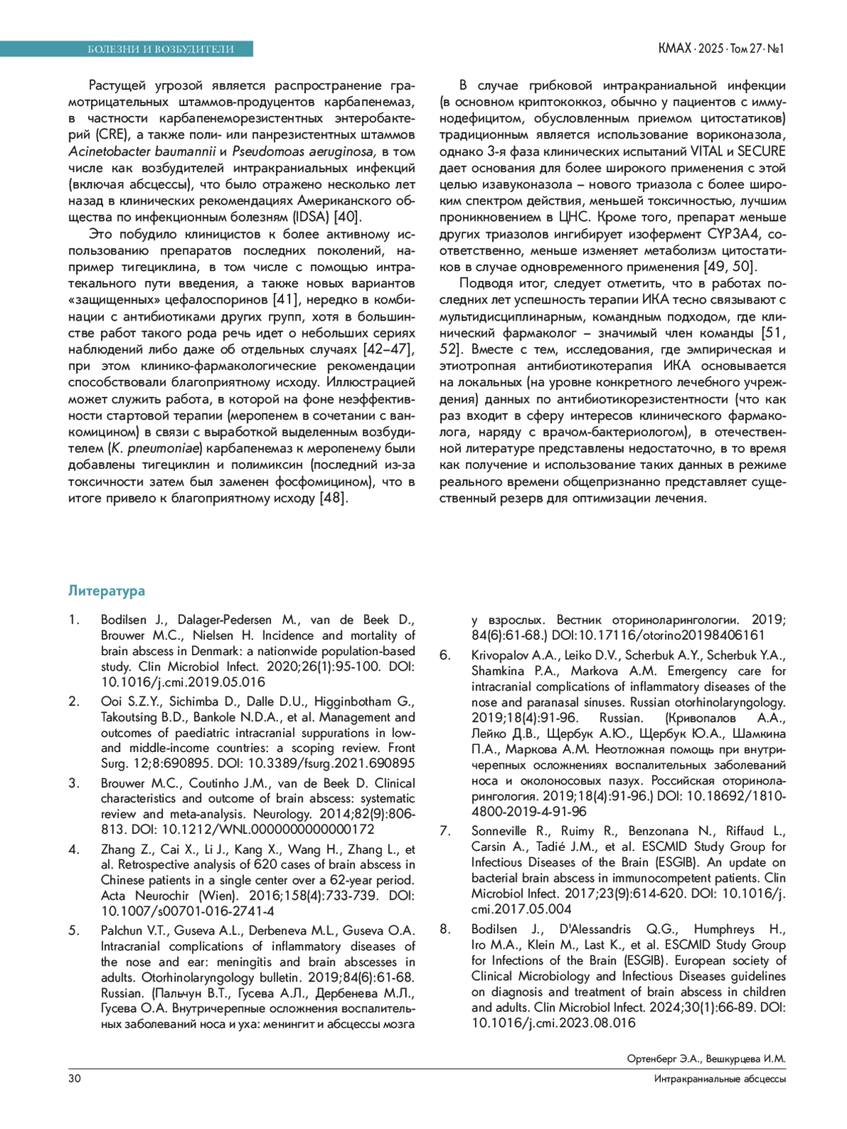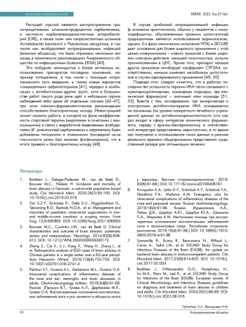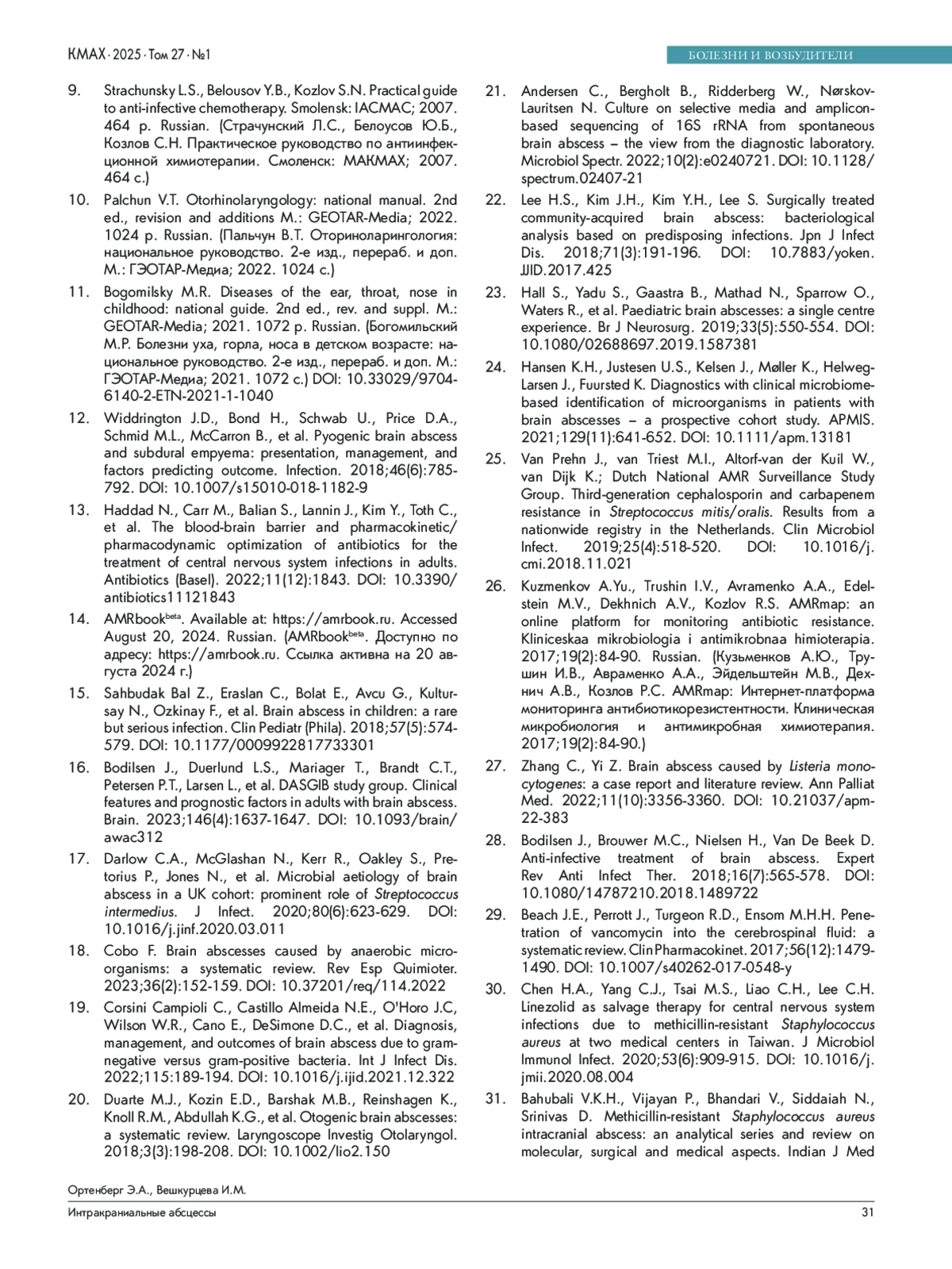 35. Evans T.J., Jawad S., Kalyal N., Nadarajah A., Amarouche M., Stapleton S., et al. Retrospective review of the epidemiology, microbiology, management and outcomes of intra-cranial abscesses at a neurosurgical tertiary referral centre, 2018-2020. Ann Clin Microbiol Antimicrob. 2022;21(1):58. DOI: 10.1186/s12941-022-00550-2