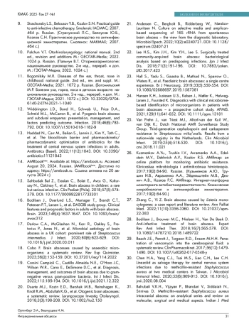 17. Darlow C.A., McGlashan N., Kerr R., Oakley S., Pretorius P., Jones N., et al. Microbial aetiology of brain abscess in a UK cohort: prominent role of Streptococcus intermedius. J Infect. 2020;80(6):623-629. DOI: 10.1016/j.jinf.2020.03.011