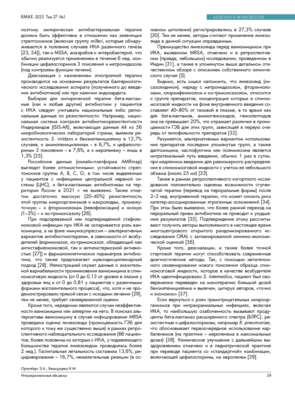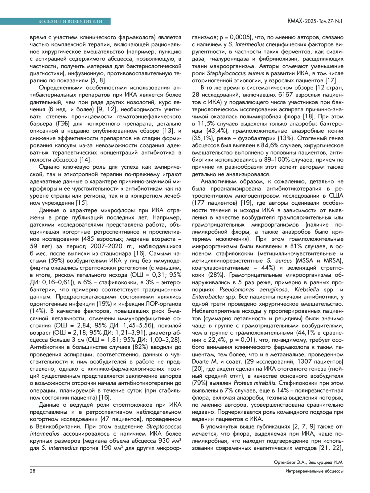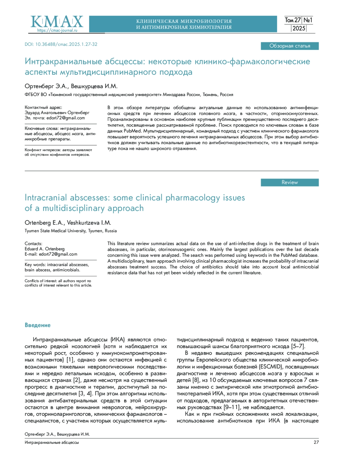 Интракраниальные абсцессы (ИКА) являются относительно редкой нозологией (хотя и наблюдается их некоторый рост, особенно у иммунокомпрометированных пациентов) [1], однако они остаются инфекцией с возможными тяжелыми неврологическими последствиями и нередко летальным исходом, особенно в развивающихся странах [2], даже несмотря на существенный прогресс в диагностике и терапии, достигнутый за последние десятилетия [3, 4]. При этом алгоритмы использования антибактериальных средств в этой ситуации остаются в центре внимания неврологов, нейрохирургов, оториноларингологов, клинических фармакологов – специалистов, с участием которых осуществляется мультидисциплинарный подход к ведению таких пациентов, повышающий шансы благоприятного исхода [5–7].