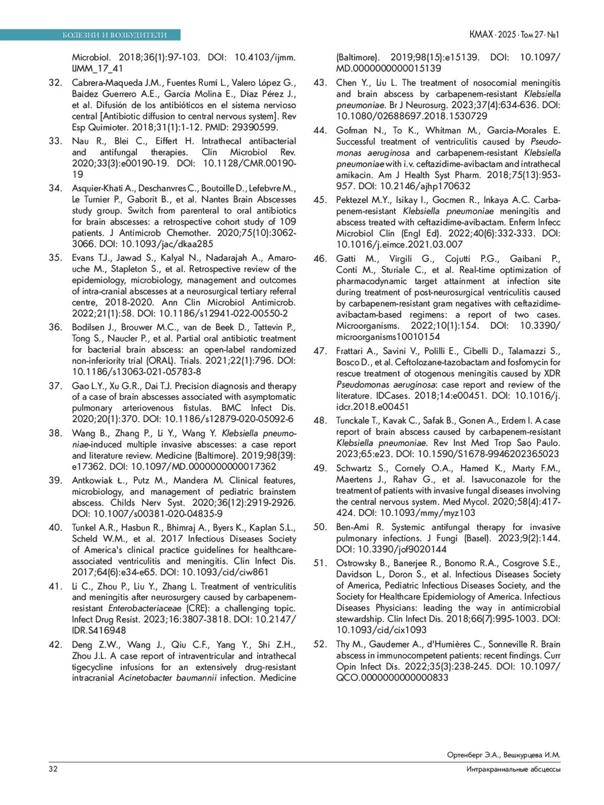 45. Pektezel M.Y., Isikay I., Gocmen R., Inkaya A.C. Carbapenem-resistant Klebsiella pneumoniae meningitis and abscess treated with ceftazidime-avibactam. Enferm Infecc Microbiol Clin (Engl Ed). 2022;40(6):332-333. DOI: 10.1016/j.eimce.2021.03.007