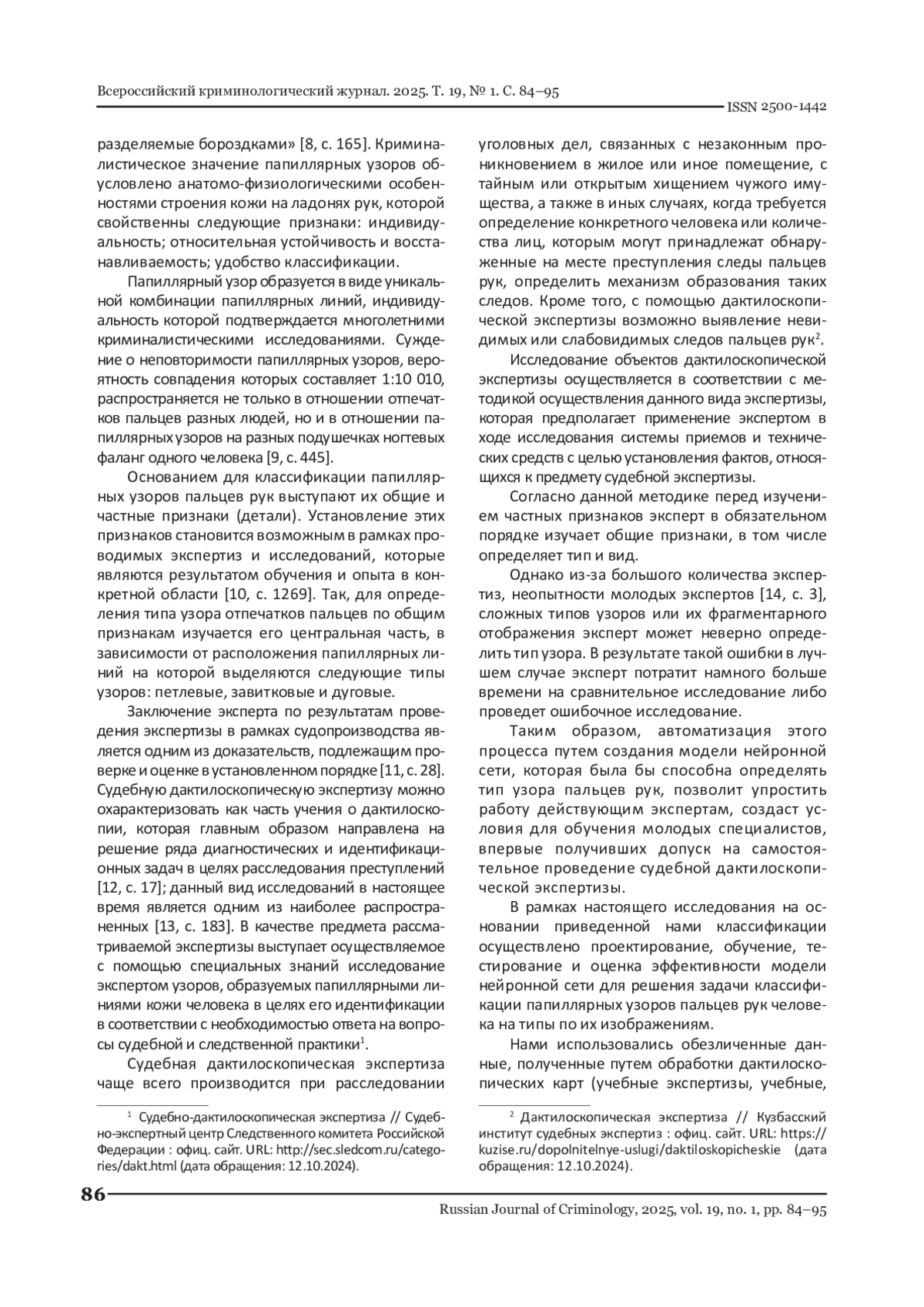 Работа посвящена рассмотрению вопросов, связанных с изучением папиллярных узоров ладоней и пальцев рук человека для дальнейшего решения задач идентификационного и диагностического характера. Авторами отмечается тенденция к стремительному развитию технологий искусственного интеллекта, среди которых особое место занимают нейронные сети. При этом также высказывается мнение о том, что использование нейронных сетей в криминалистике, особенно в задачах дактилоскопии, сопряжено с рядом трудностей, включая сбор, преобразование и обработку данных. Отмечается, что разработка модели по исследованию папиллярных узоров на основе нейросетевого подхода может найти применение как в реальной практике судебной экспертной деятельности и предварительном исследовании следов на месте происшествия лицами не обладающими специальными знаниями (оперативные работники, следователи, дознаватели), так и в образовательной деятельности для подготовки специалистов. В работе авторы описывают архитектуру используемой нейронной сети, процесс подготовки данных, включающий предварительную обработку изображений и создание тренировочного и тестового наборов, а также демонстрируют результаты экспериментальной проверки эффективности предложенного метода, включая показатели точности и полноты.