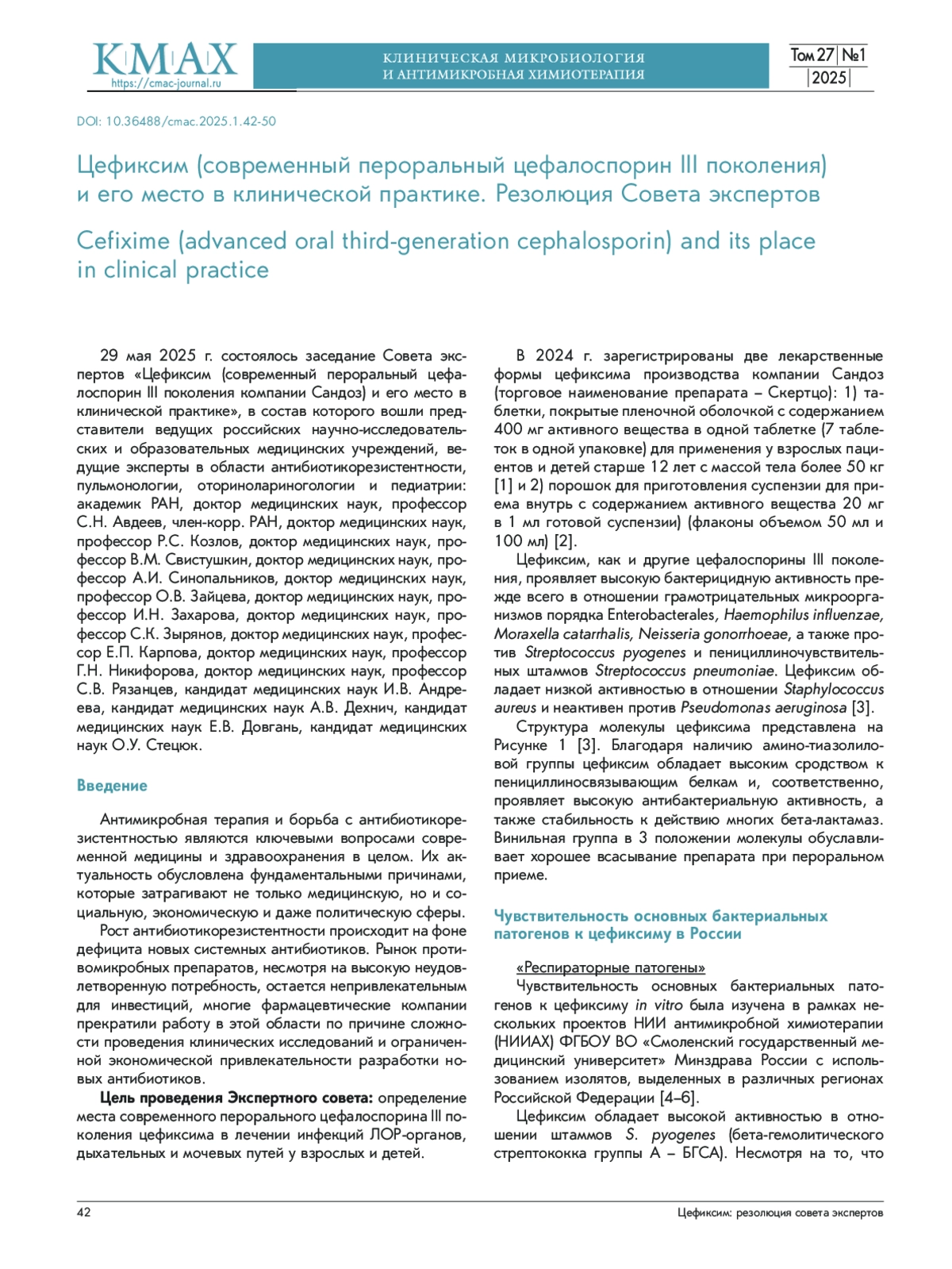 29 мая 2025 г. состоялось заседание Совета экспертов «Цефиксим (современный пероральный цефалоспорин III поколения компании Сандоз) и его место в клинической практике», в состав которого вошли представители ведущих российских научно-исследовательских и образовательных медицинских учреждений, ведущие эксперты в области антибиотикорезистентности, пульмонологии, оторинолариногологии и педиатрии: академик РАН, доктор медицинских наук, профессор С. Н. Авдеев, член-корр. РАН, доктор медицинских наук, профессор Р. С. Козлов, доктор медицинских наук, профессор В. М. Свистушкин, доктор медицинских наук, профессор А. И. Синопальников, доктор медицинских наук, профессор О. В. Зайцева, доктор медицинских наук, профессор И. Н. Захарова, доктор медицинских наук, профессор С. К. Зырянов, доктор медицинских наук, профессор Е. П. Карпова, доктор медицинских наук, профессор Г. Н. Никифорова, доктор медицинских наук, профессор С. В. Рязанцев, кандидат медицинских наук И. В. Андреева, кандидат медицинских наук А. В. Дехнич, кандидат медицинских наук Е. В. Довгань, кандидат медицинских наук О. У. Стецюк.