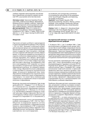 Цель статьи – показать развитие учебного книгоиздания в Тувинской Народной Республике (ТНР) и связь образования с социально- экономическими и культурными изменениями, происходившими в регионе с 1921 по 1944 гг.