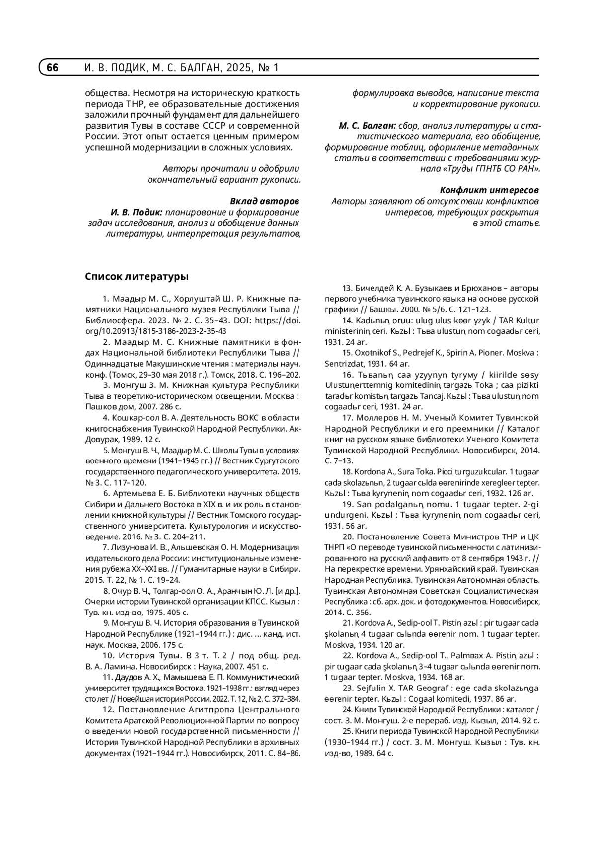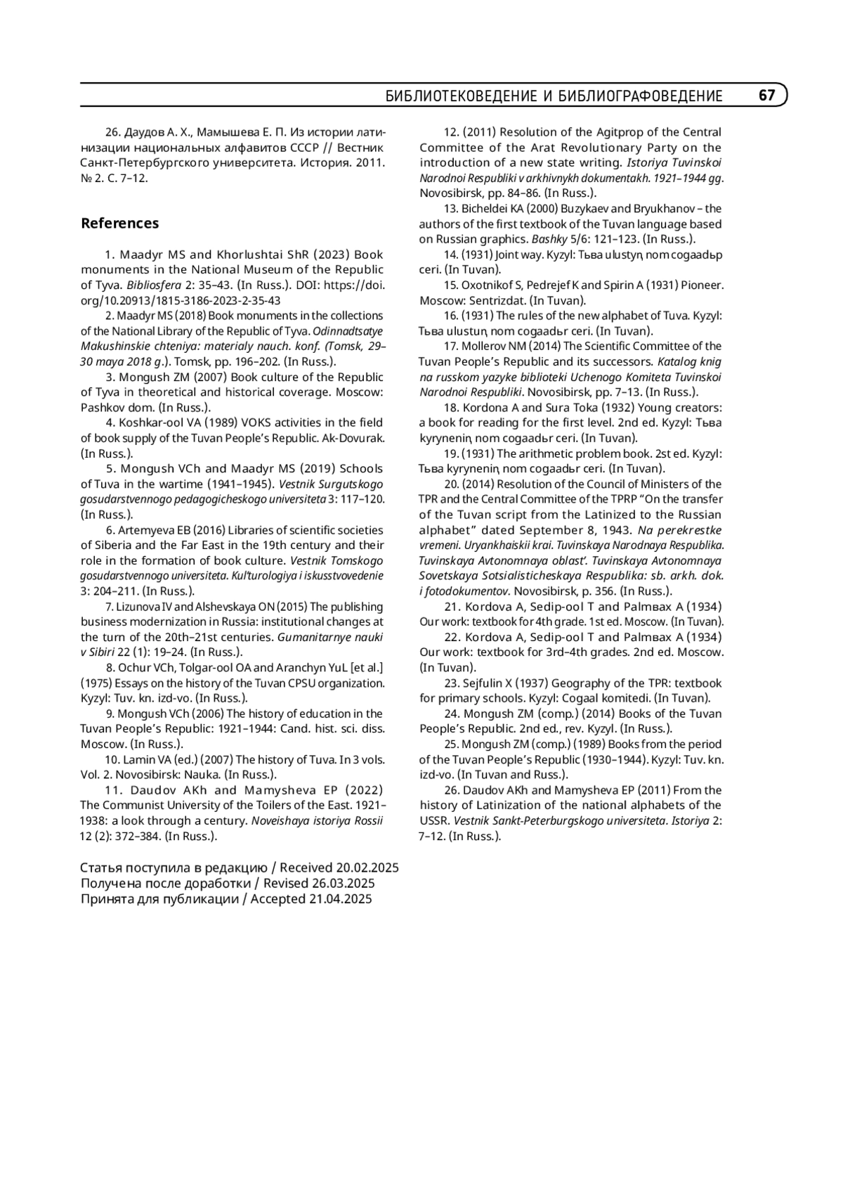 1. Маадыр М. С., Хорлуштай Ш. Р. Книжные памятники Национального музея Республики Тыва // Библиосфера. 2023. № 2. С. 35-43. https://doi.org/10.20913/1815-3186-2023-2-35-43