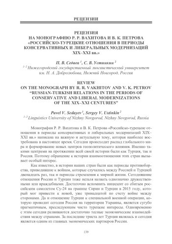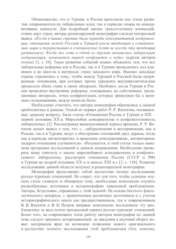 Монография Р. Р. Вахитова и В. К. Петрова «Российско-турецкие отношения в периоды консервативных и либеральных модернизаций XIX– XXI вв.» написана на важную и актуальную тему, которая наиболее востребована в настоящее время. Сегодня происходит распад глобального мира и формирование новых центров геополитического влияния. Именно такими центрами на протяжении всей своей истории были как Турция, так и Россия. Поэтому обращение к истории взаимоотношения этих стран вызывает особый интерес.
