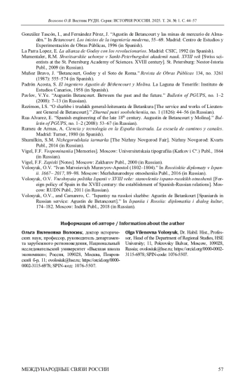 5. Волосюк О.В., Камареро К. Испанцы на русской службе: Агустин де Бетанкур // Испания и Россия: дипломатия и диалог культур. М.: Индрик, 2018. С. 174-182.
