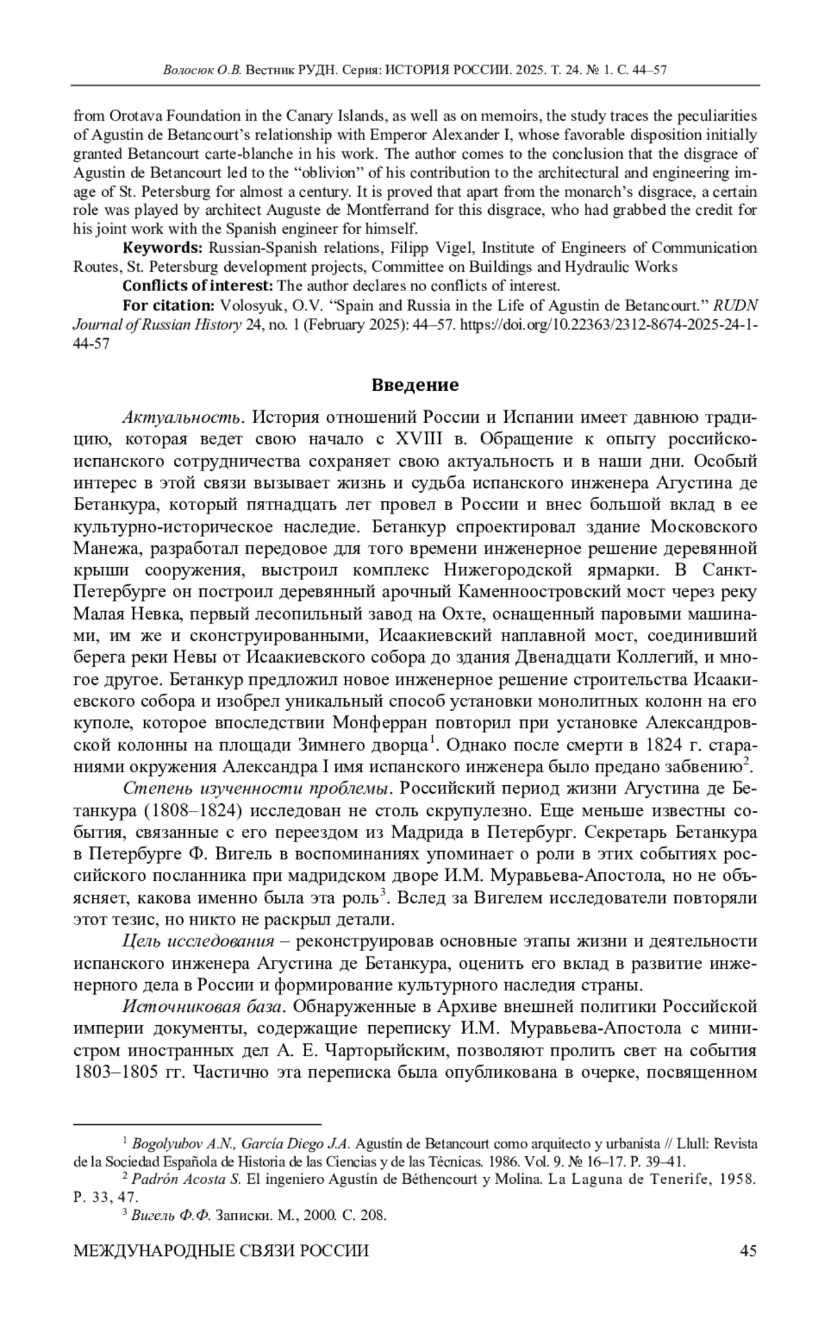 Исследуются основные этапы жизни и деятельности испанского инженера Агустина де Бетанкура, который оказал значительное влияние на развитие инженерного дела в России в начале XIX в. и внес заметный вклад в формирование культурного наследия страны. Особое внимание уделяется малоизученным моментам его биографии: причинам переезда из Испании в Россию и роли в этом российского посланника в Мадриде И. М. Муравьева-Апостола, уточнению некоторых ранее неизвестных деталей его пребывания в Российской империи. На основе документов из российских (АВП РИ, ГА РФ) и испанских архивов (Национального исторического архива, Генерального Архива Индий, Исторического архива дворянства), документов канарского Фонда Оротава, а также мемуарной литературы прослежены особенности отношений Бетанкура с императором Александром I, благосклонное отношение которого обеспечило знаменитому испанцу полный carte-blanche в работе. Автор приходит к выводу, что опала Агустина де Бетанкура привела к «забвению» его вклада в архитектурно-инженерный облик Санкт-Петербурга практически на столетие. Доказывается, что помимо монаршей немилости определенную роль сыграл и французский архитектор Огюст де Монферран, фактически присвоивший себе единоличную славу от совместных работ с испанским инженером.