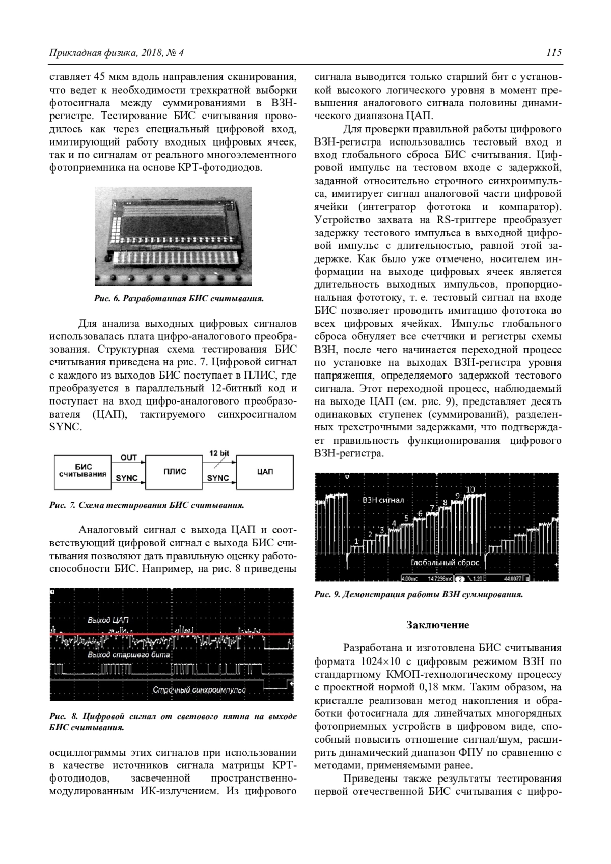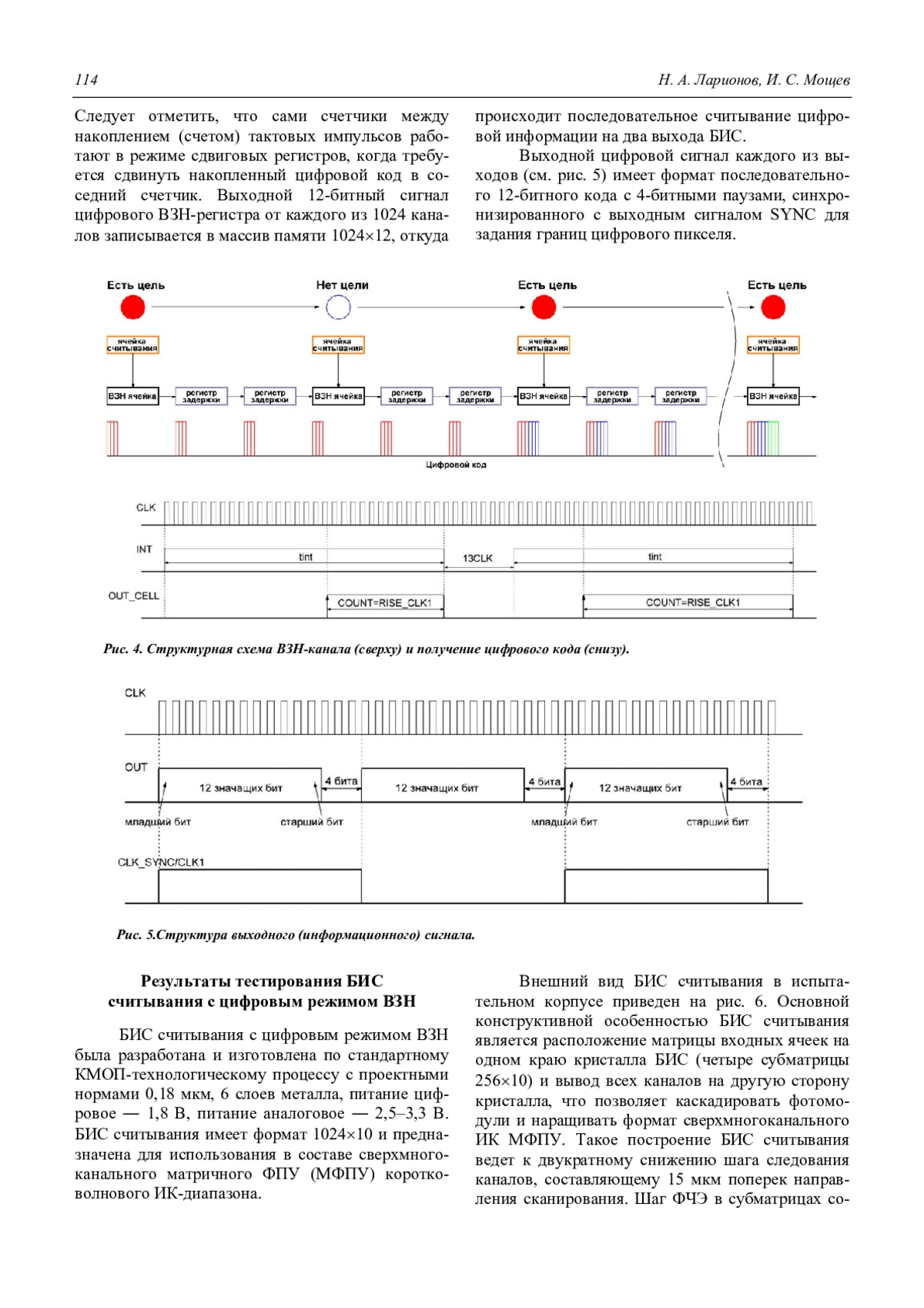 Приведены также результаты тестирования первой отечественной БИС считывания с цифровым режимом ВЗН формата 102410 и с шагом каналов 15 мкм, причем получены выходные цифровые сигналы в формате 12-битного последовательного кода.