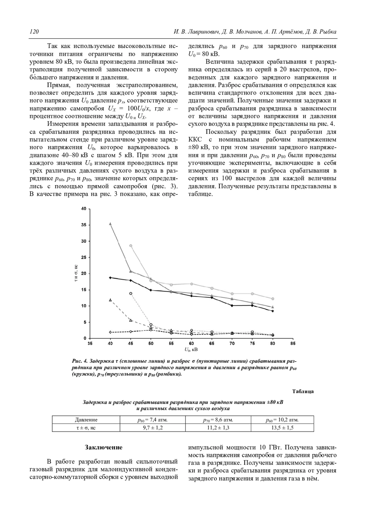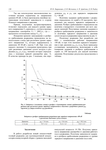 Проведённые исследования показали, что при номинальном зарядном напряжении 80 кВ и давлении сухого воздуха в разряднике равном 8,6 атм. разброс срабатывания составляет 1,3 нс. Полученная величина разброса сравнима с аналогичным показателем других разрядников [8, 9], применяемых в схемах с параллельной работой большого количества ККС [7, 11, 12], что позволяет надеяться на успешное применение разработанного разрядника в подобных системах.