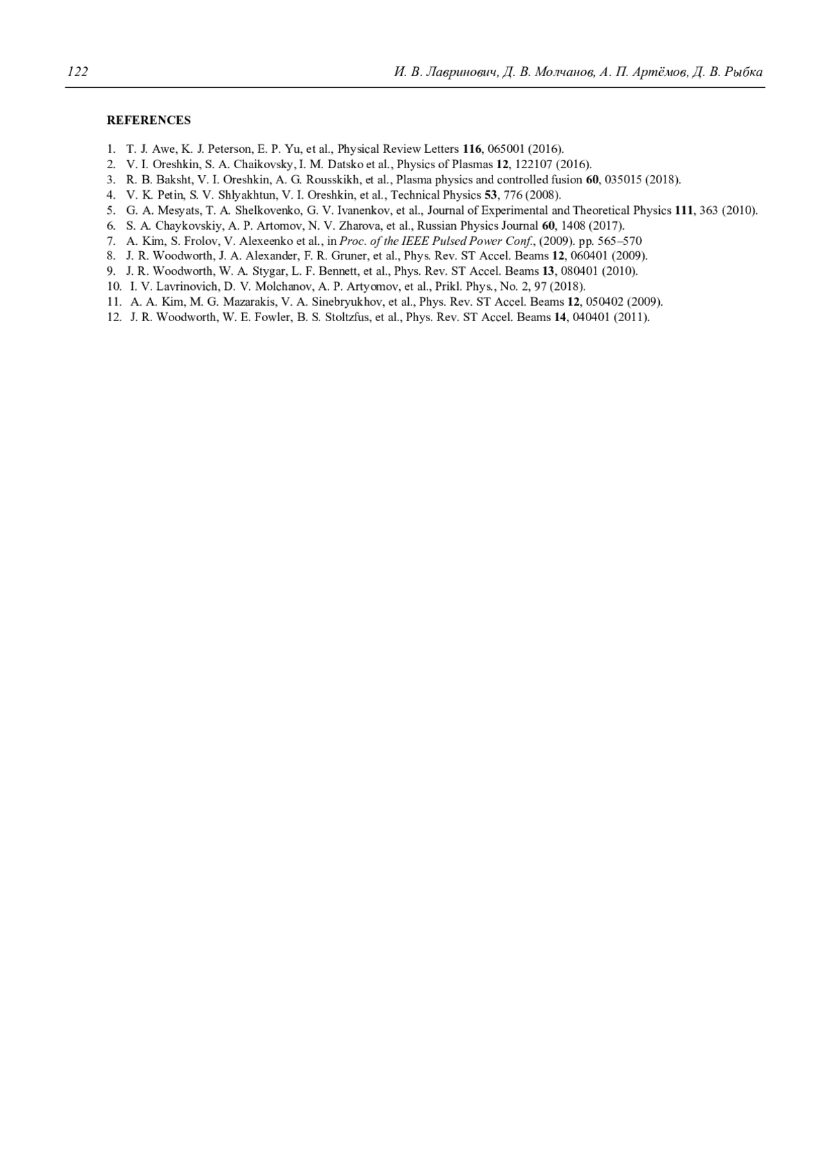 2. Oreshkin V. I., Chaikovsky S. A., Datsko I. M., Labetskaya N. A., Mesyats G. A., Oreshkin E. V., Ratakhin N. A., Rybka D. V. // Physics of Plasmas. 2016. Vol. 12(23). P. 122107.