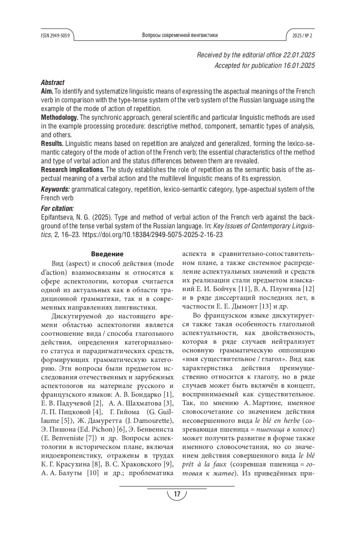 11. Бойчук Е. И. Лексико-грамматическая функция повтора (на материале французского языка) // Верхневолжский филологический вестник. 2023. № 1 (32). С. 157-166. DOI: 10.20323/2499_9679_2023_1_32_157 EDN: YFJXPM
