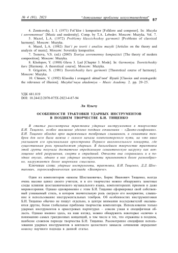 В статье рассмотрена трактовка ударных инструментов в творчестве Б. И. Тищенко, особое внимание уделено поздним сочинениям – «Данте-симфониям». Б. И. Тищенко обладал ярко выраженным тембровым слышанием, и семантика тембров для него была важна с самого начала композиторского пути, на что явно указывает его оригинальная оркестровка Первого виолончельного концерта, где существенная роль принадлежит ударным. В дальнейшем творчестве трактовка этой группы получила достаточно определенную семантическую нагрузку как воплощение идей разрушения, смерти и страданий. Отчасти она сохранилась и в поздних опусах, однако в них ударные инструменты применяются более разнообразно, нагружаются более широкими смыслами.