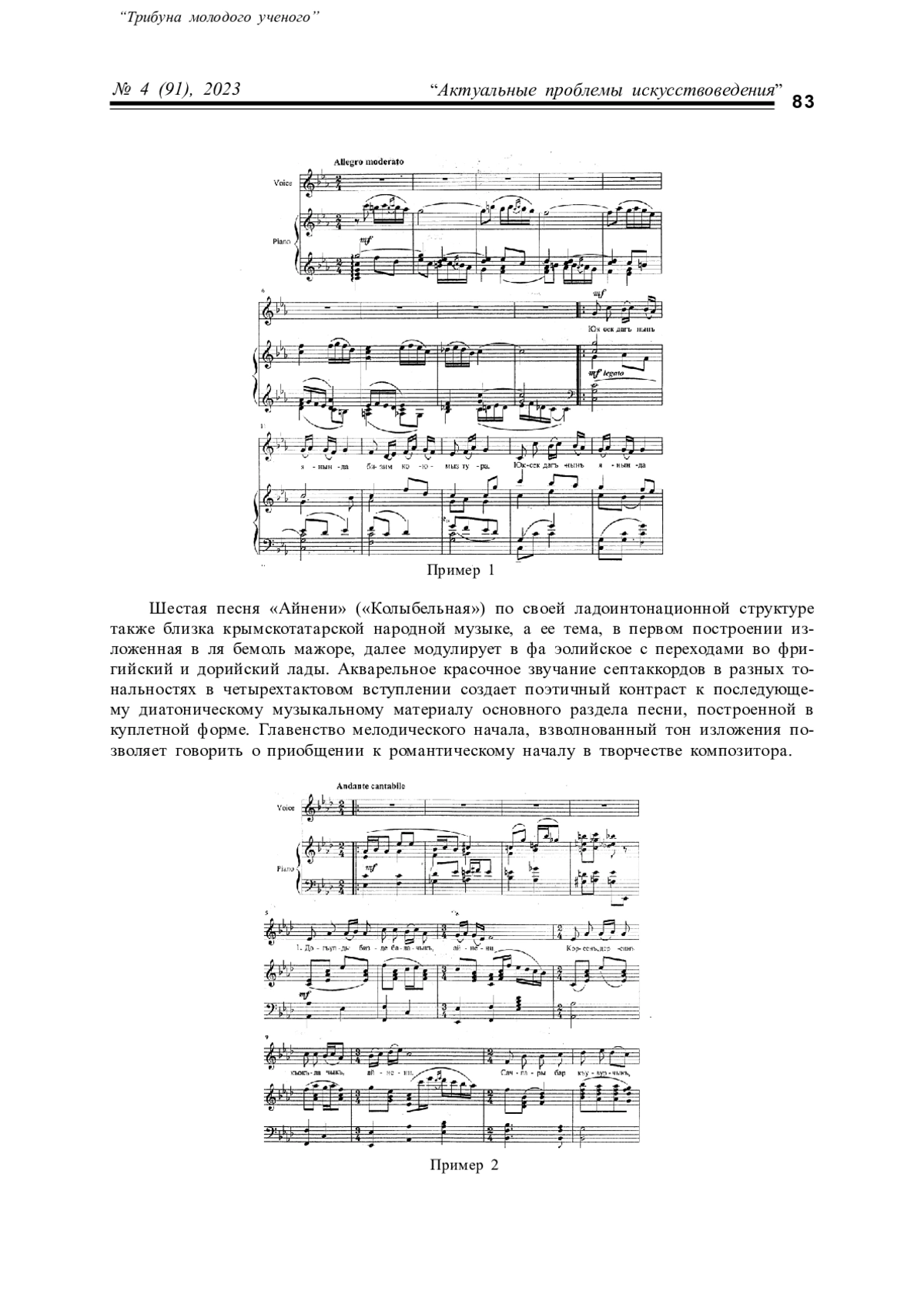 Э. Эмир – современный крымскотатарский композитор, в творчестве которого аккумулируются специфические приметы художественного мышления, как предшествующих эпох, так и XX века. Общеизвестно, что взаимодействие традиционного и инновационного в музыкальном искусстве второй половины XX века приводит к «множественности техник современного композиторского творчества» [8. С. 9]. При этом гармония, как компонент стилевой системы, также обновляется, включая в себя аккорды нетерцового строения и теряя тонально-функциональные связи