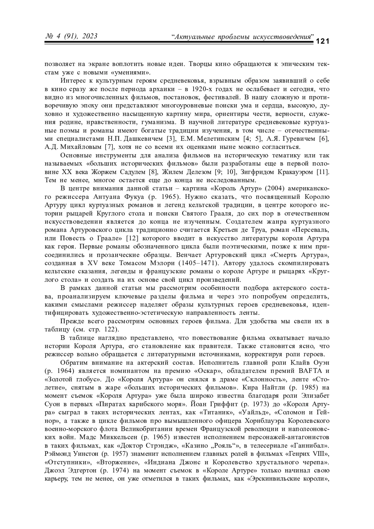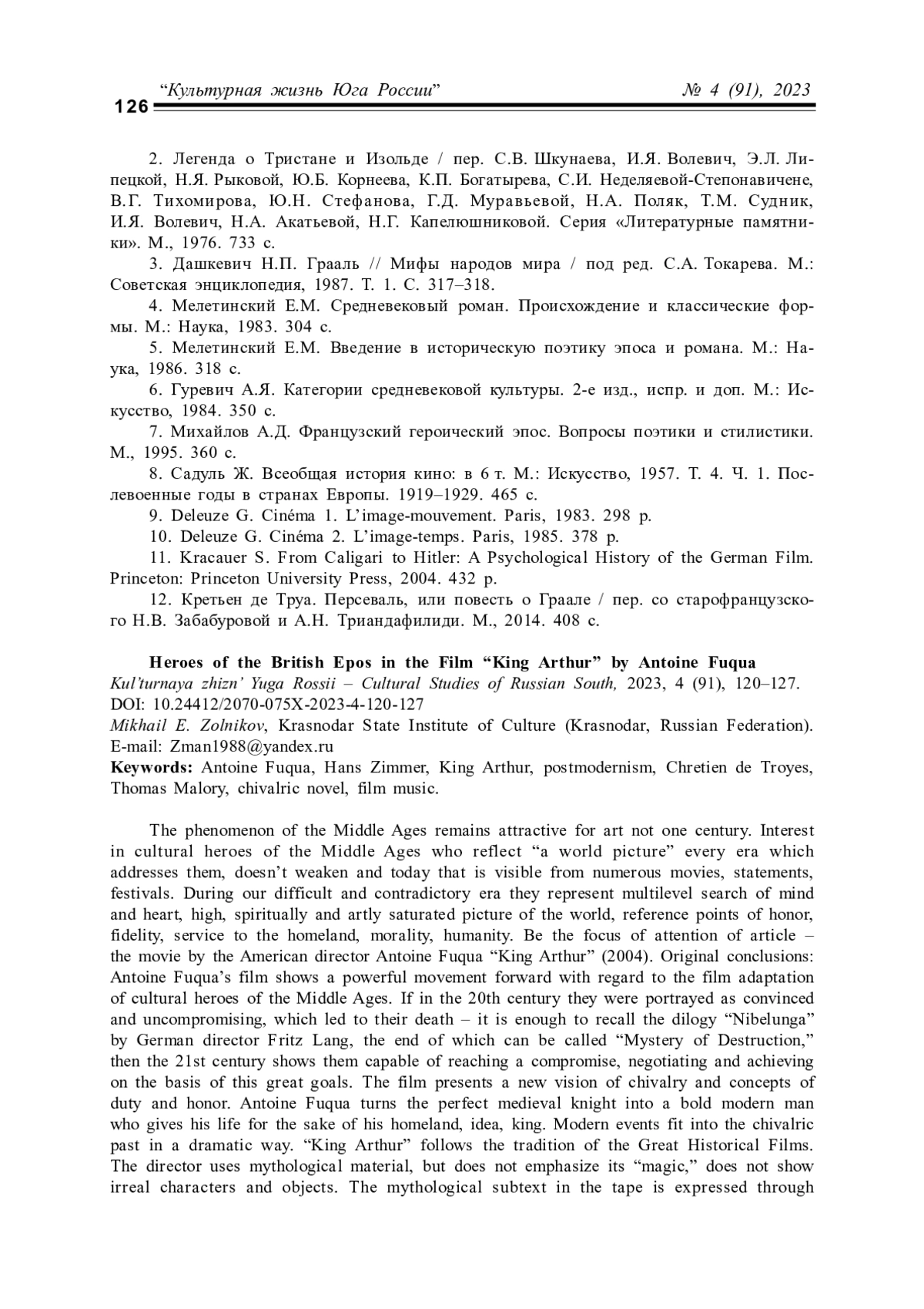 Интерес к культурным героям средневековья ныне переживает масштабный взлет. Режиссеры XXI века решают сверхзадачи их приближения к массовой аудитории. Научная новизна статьи определяется выявлением путей, способов, механизмов и стилистических рамок актуализации средневекового материала. Использованы контекстный подход, герменевтический и образно-стилистический методы. Автор статьи приходит к выводам, что фильм «Король Артур» вписывается в пространство постмодернизма, в нем представлено новое видение рыцарства, понятий долга и чести. Музыка Ханса Циммера позволяет расставить акценты, обозначить образные сферы, связи между героями. Антуан Фукуа и Ханс Циммер показали, что культурное прошлое обладает многоуровневым потенциалом воздействия на настоящее средствами искусства