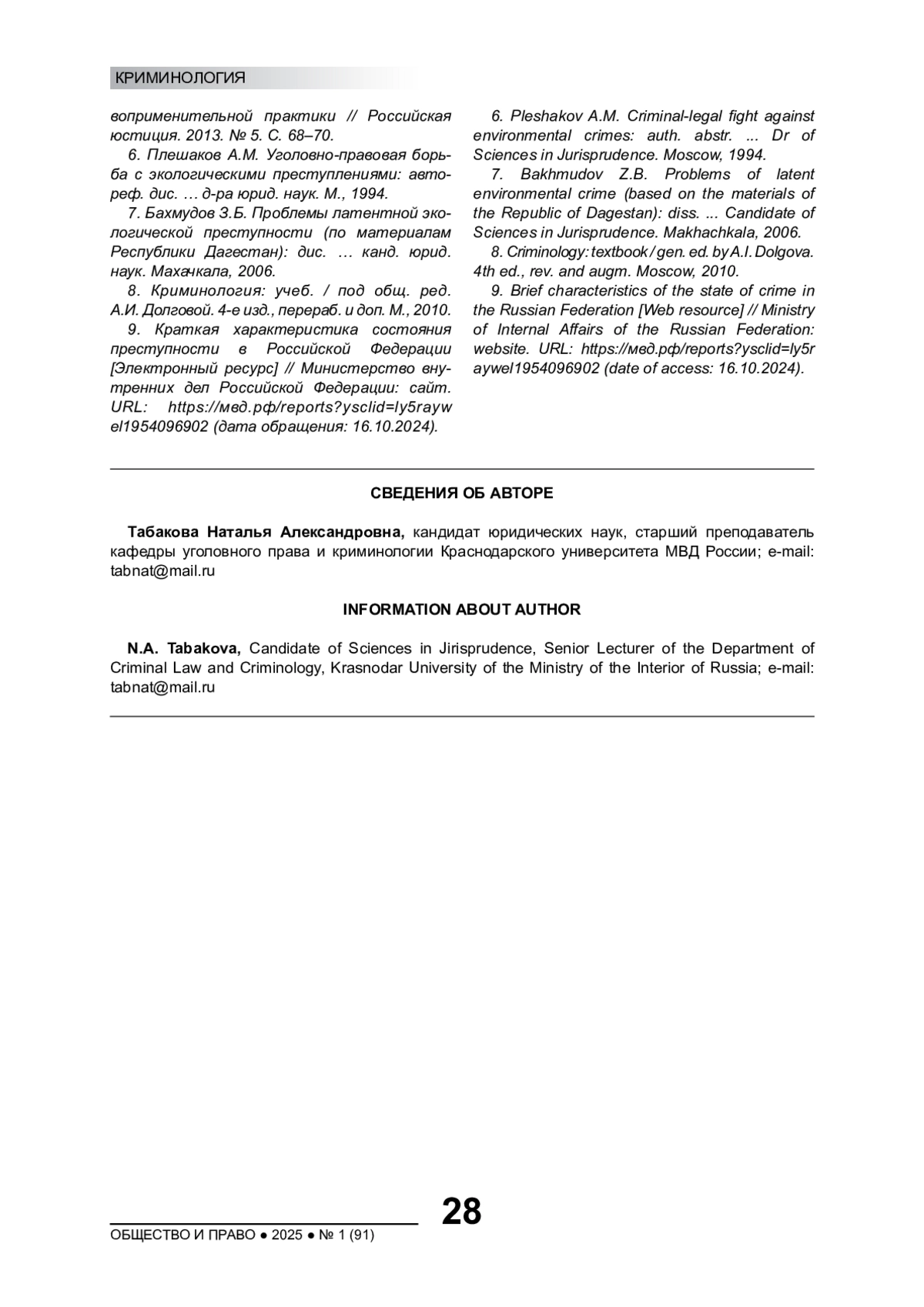 ТАБАКОВА Н. А. СОСТОЯНИЕ, ДЕТЕРМИНАЦИЯ И ТЕНДЕНЦИИ ПРЕСТУПНОСТИ В СФЕРЕ ДОБЫЧИ И ОБОРОТА ОСОБО ЦЕННЫХ РАСТЕНИЙ // ОБЩЕСТВО И ПРАВО. 2025. № 1 (91)