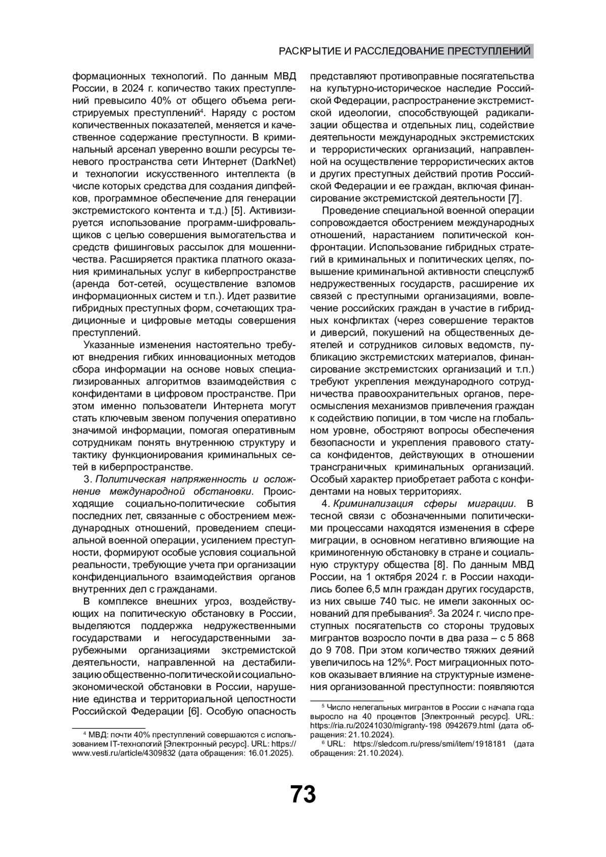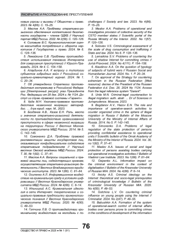 В последние годы особый комплекс вызовов и угроз безопасности России обусловлен существенным обновлением социальной реальности, связанным со сложными политическими процессами, формированием новой многополярной системы миропорядка, резким обострением противостояния недружественным государствам, информатизацией всех сфер функционирования общества, глубоким преобразованием глобальной экономики на основе ее масштабной цифровизации. Среди наиболее значимых угроз все более проблемным становится противодействие криминальной среде, кардинально меняющей свои базовые характеристики