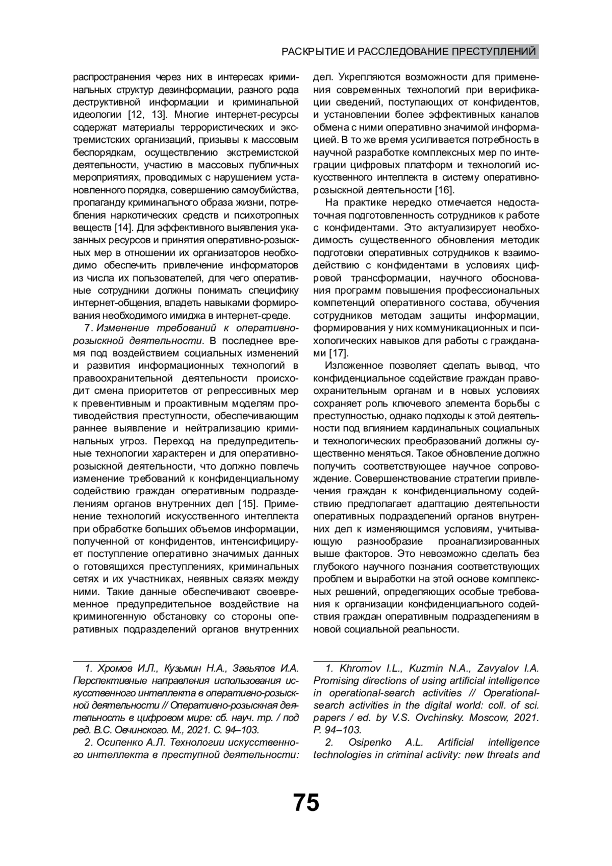 1. Хромов И.Л., Кузьмин Н.А., Завьялов И.А. Перспективные направления использования искусственного интеллекта в оперативно-розыскной деятельности // Оперативно-розыскная деятельность в цифровом мире: сб. науч. тр. / под ред. В.С. Овчинского. М., 2021. С. 94-103. EDN: XETTDG