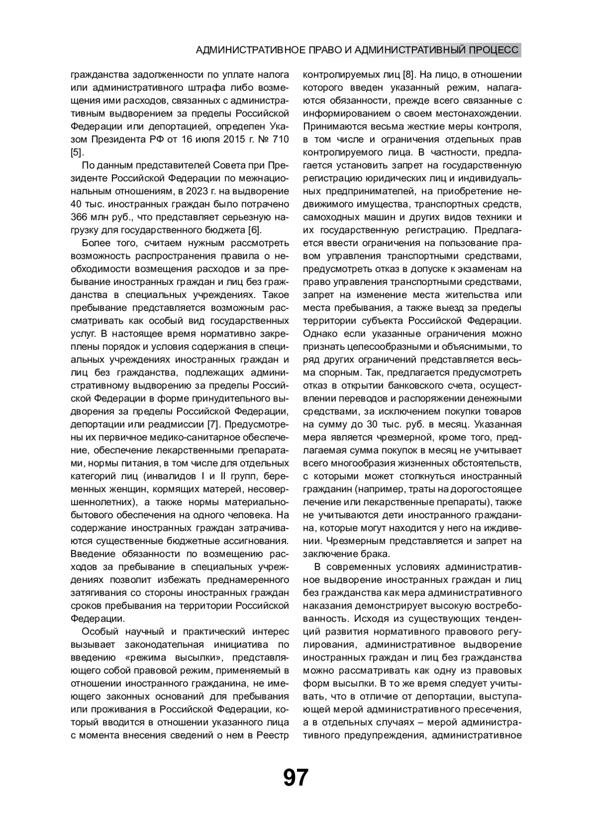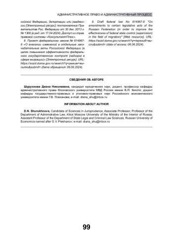 8. Проект федерального закона № 614967-8 “О внесении изменений в отдельные законодательные акты Российской Федерации (в целях повышения эффективности федерального государственного контроля (надзора) в сфере миграции)” [Электронный ресурс]. URL: https://sozd.duma.gov.ru/search?q=режим+высылки&submit= (дата обращения: 06.06.2024).