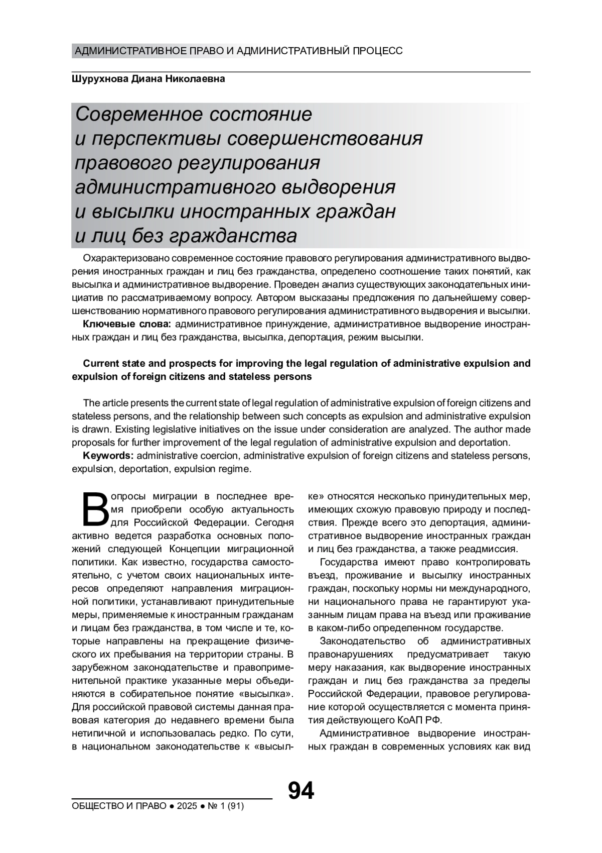 Охарактеризовано современное состояние правового регулирования административного выдворения иностранных граждан и лиц без гражданства, определено соотношение таких понятий, как высылка и административное выдворение. Проведен анализ существующих законодательных инициатив по рассматриваемому вопросу. Автором высказаны предложения по дальнейшему совершенствованию нормативного правового регулирования административного выдворения и высылки
