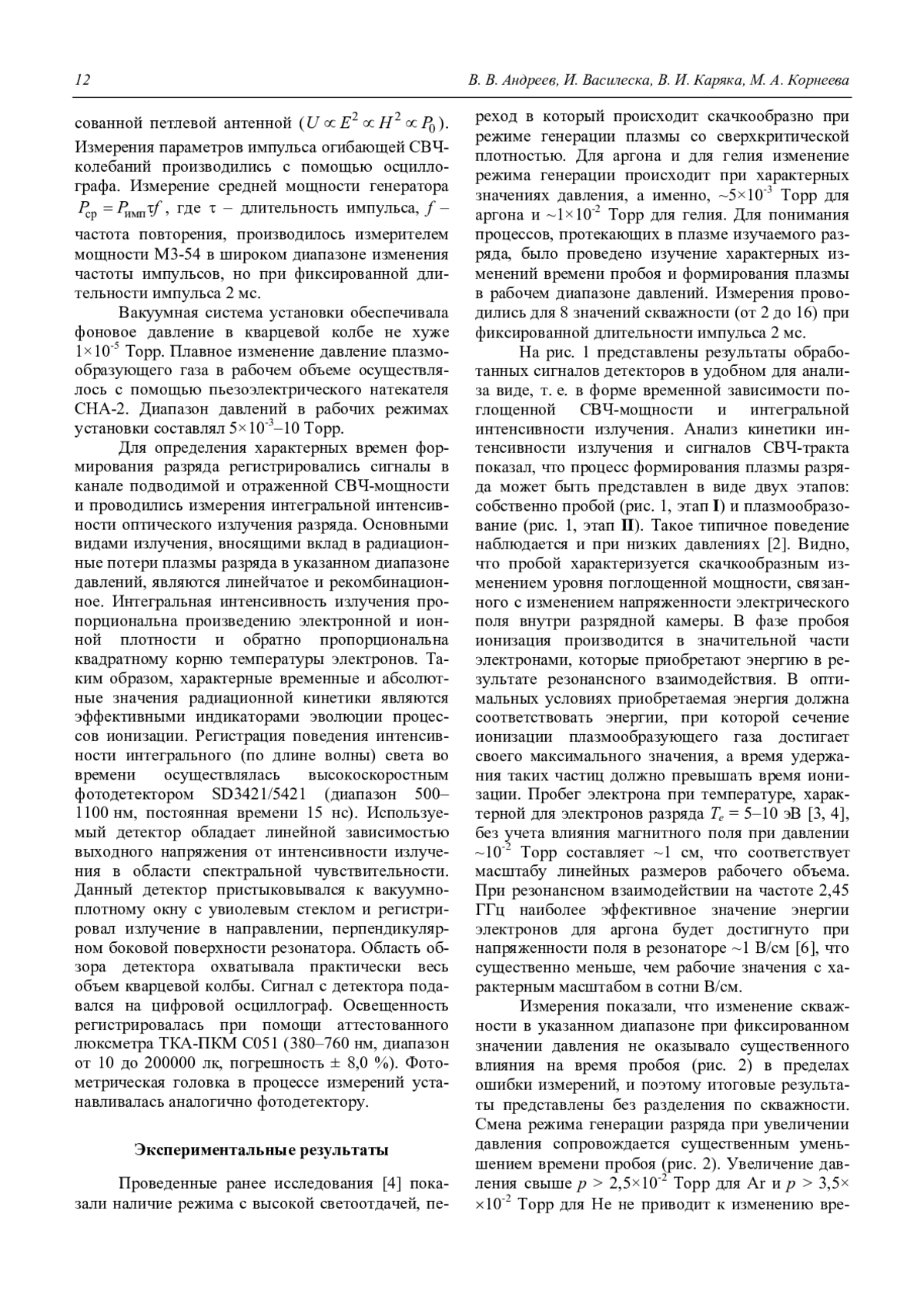Андреев В. В., Василеска И., Каряка В. И., Корнеева М. А. Особенности формирования плазмы импульсно-периодического резонансного СВЧ-разряда в инертных газах (Ar, He) при пониженном давлении 11