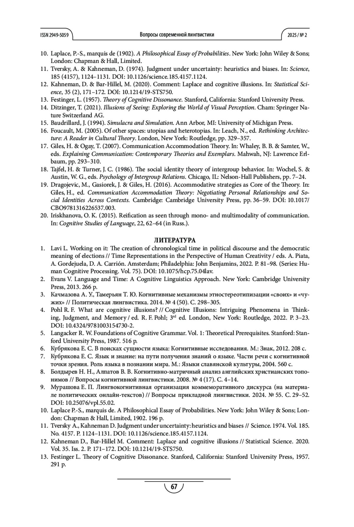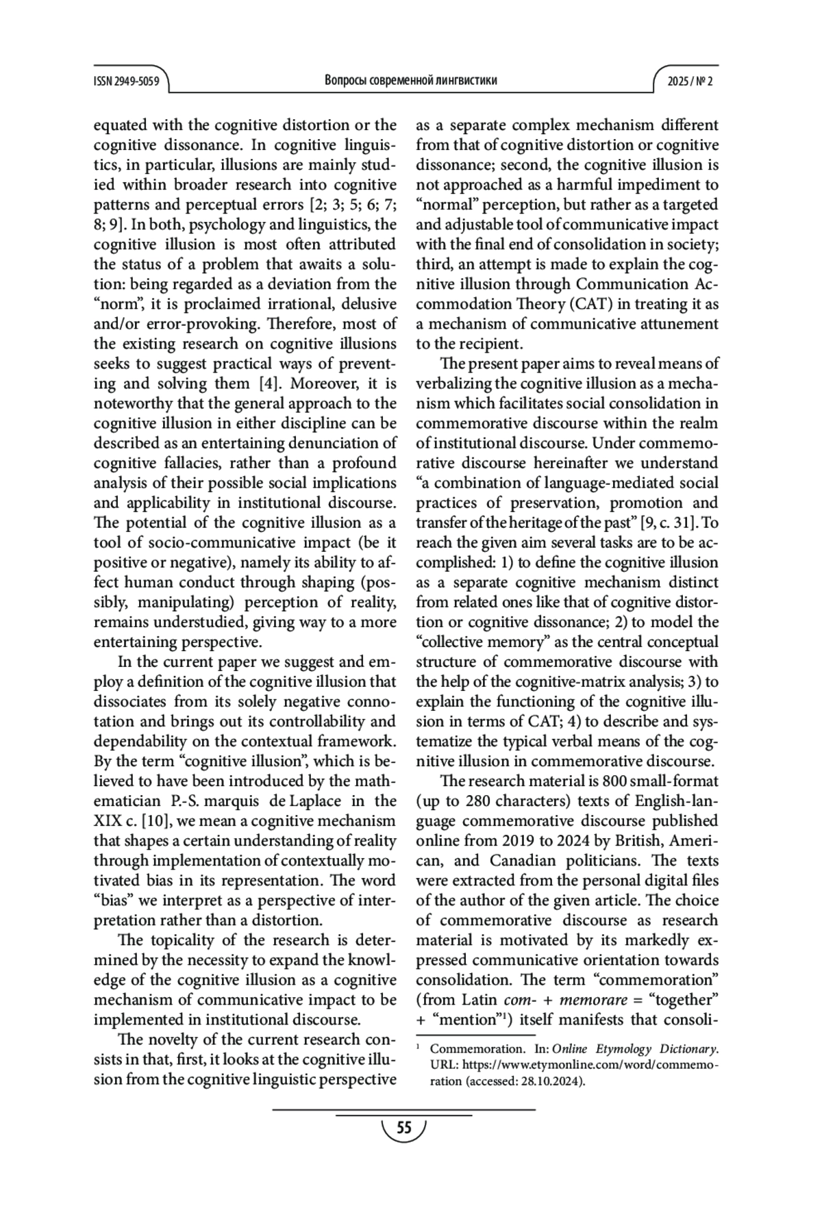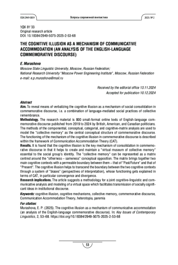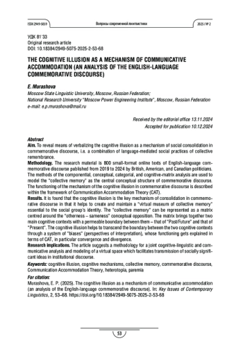 Статья: КОГНИТИВНАЯ ИЛЛЮЗИЯ КАК МЕХАНИЗМ КОММУНИКАТИВНОЙ АККОМОДАЦИИ (НА МАТЕРИАЛЕ АНГЛОЯЗЫЧНОГО КОММЕМОРАТИВНОГО ДИСКУРСА) (2025)