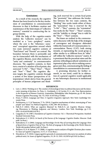 Ключевые фразы: когнитивная иллюзия, когнитивные механизмы, коллективная память, коммеморативный дискурс, теория коммуникативной аккомодации, гетеротопия, паремия