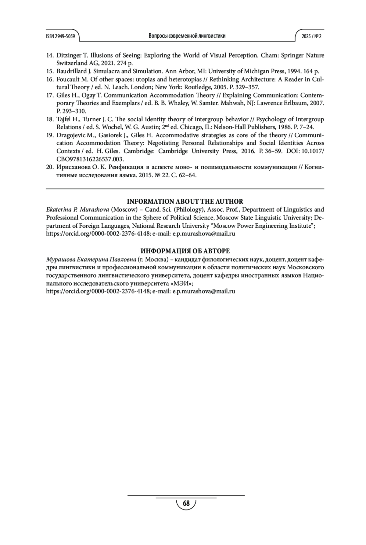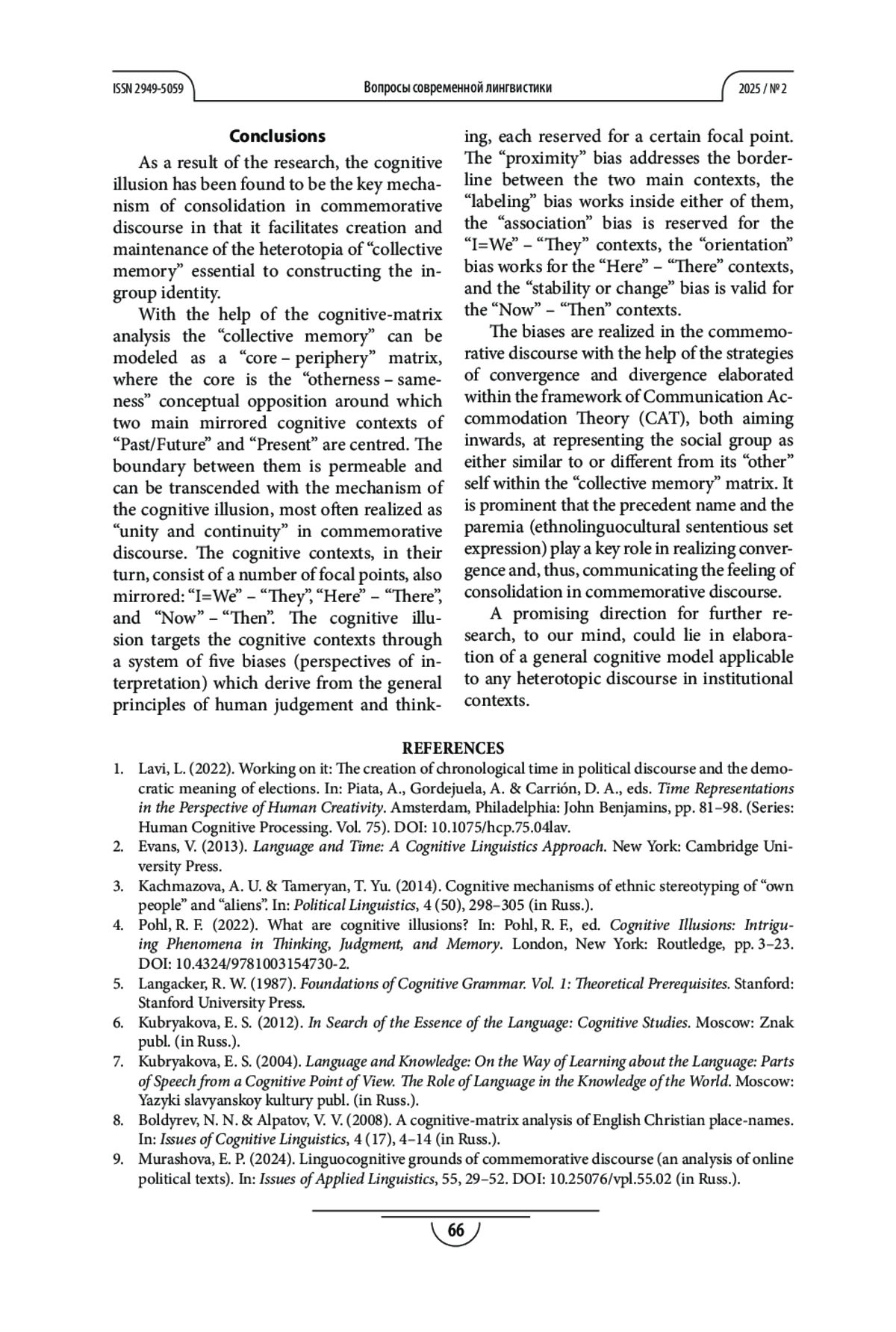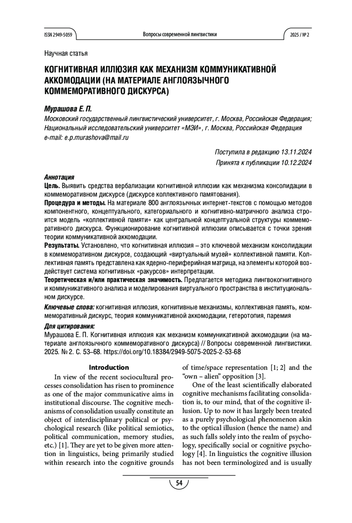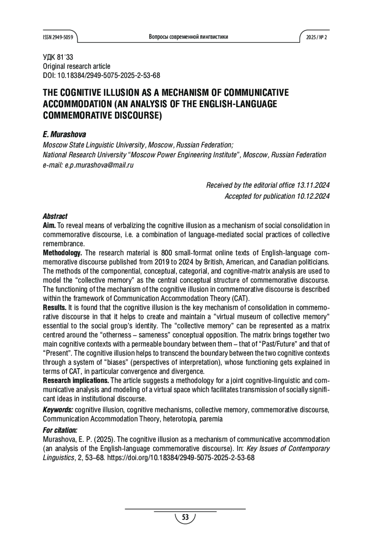 МУРАШОВА Е. П. КОГНИТИВНАЯ ИЛЛЮЗИЯ КАК МЕХАНИЗМ КОММУНИКАТИВНОЙ АККОМОДАЦИИ (НА МАТЕРИАЛЕ АНГЛОЯЗЫЧНОГО КОММЕМОРАТИВНОГО ДИСКУРСА) // ВОПРОСЫ СОВРЕМЕННОЙ ЛИНГВИСТИКИ. 2025. № 2