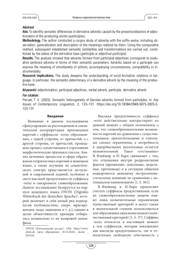 Внимание в данном исследовании сфокусировано на расхождениях в семантической интерпретации производных наречий с суффиксом -weise, образованных, с одной стороны, от причастий, а с другой стороны, от причастий, прошедших процесс адъективации и утративших морфологические признаки глагола. Анализ активных процессов в сфере образования отпричастных наречий в немецком языке, а также изучение их семантического спектра представляется актуальной и современной задачей, особенно в свете высокой продуктивности суффикса -weise в синхронном словообразовании.