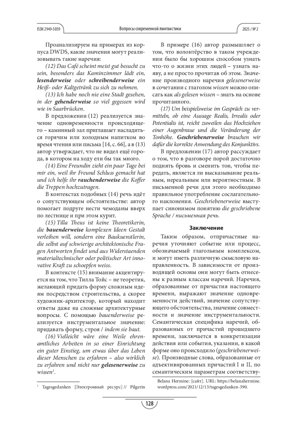 11. Алексеева А. Б., Никитина Е. А. Словообразование коллоквиальных наречий с компонентом weise в современном немецком языке // Современная наука: актуальные проблемы теории и практики. Серия: Гуманитарные науки. 2020. № 6-2. С. 102-104. DOI: 10.37882/2223-2982.2020.06-2.01 EDN: MRBFFL