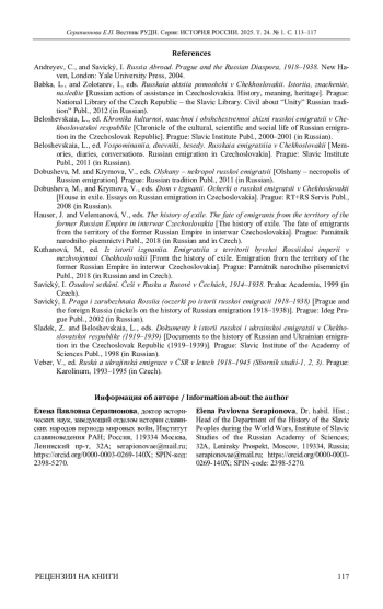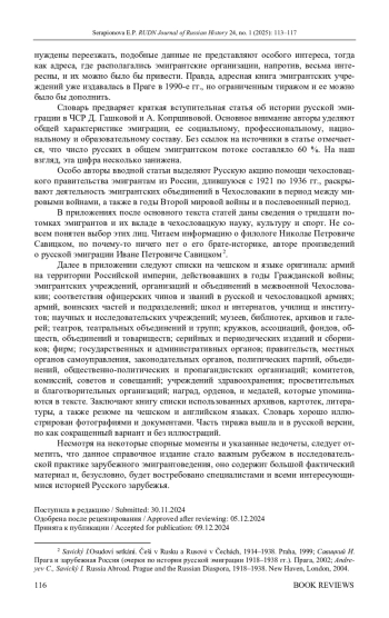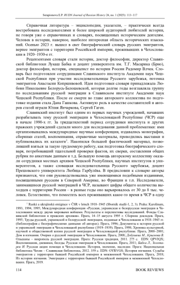 Для цитирования: Серапионова Е. П. Рецензия на книгу: Osobnosti emigrace z území Ruské říše v meziválečním Československu. Biografický slovník / Eds. Dana Hašková, Anastazie Kopřivová, Ljubov Běloševská (†), Julie Jančárková, Sergej Gagen. Praha: Slovanský ústav AV ČR, v. v. i. Academia, 2023. 750 s. // Вестник Российского университета дружбы народов. Серия: История России. 2025. Т. 24. № 1. С. 113–117. https://doi. org/10.22363/2312-8674-2025-24-1-113-117