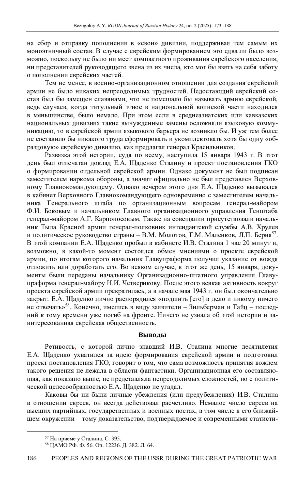 Участие советских евреев в вооруженной борьбе против нацистской Германии в качестве военнослужащих Красной армии до сих пор изучено недостаточно. Одной из любопытных тем является попытка создания еврейских национальных частей для борьбы на советско-германском фронте. В центре анализа в данной статье находится комплекс документов, обнаруженный автором в фонде Главного управления формирования и укомплектования войск (Главупраформа) Красной армии в Центральном архиве Минобороны РФ. На основе этого и других документальных источников рассматривается история нереализованного проекта формирования Отдельной еврейской армии в начале 1943 г.: причины и обстоятельства возникновения общественного запроса на создание еврейской воинской части в начале войны; трансляция этого запроса через обращения инициативных лиц в адрес органов государственной власти и общественных организаций; переадресация обращений воентехника 1-го ранга Г. Л. Зильбермана заместителю наркома обороны Е. А. Щаденко; разработка под руководством Щаденко проекта еврейской армии; анализ реализуемости проекта и обстоятельств его отклонения высшей властью страны. В статье также рассмотрены особенности представленности евреев в Красной армии, их служебного положения и продвижения по службе и отражение их усилий на фронте в советском общественном сознании. Сделан вывод о том, что замысел формирования еврейской армии был вполне реализуем с организационной точки зрения, однако в глазах руководства страны он не имел той политической актуальности, которой обладали иные, осуществляемые в тот же период проекты национальных воинских формирований.