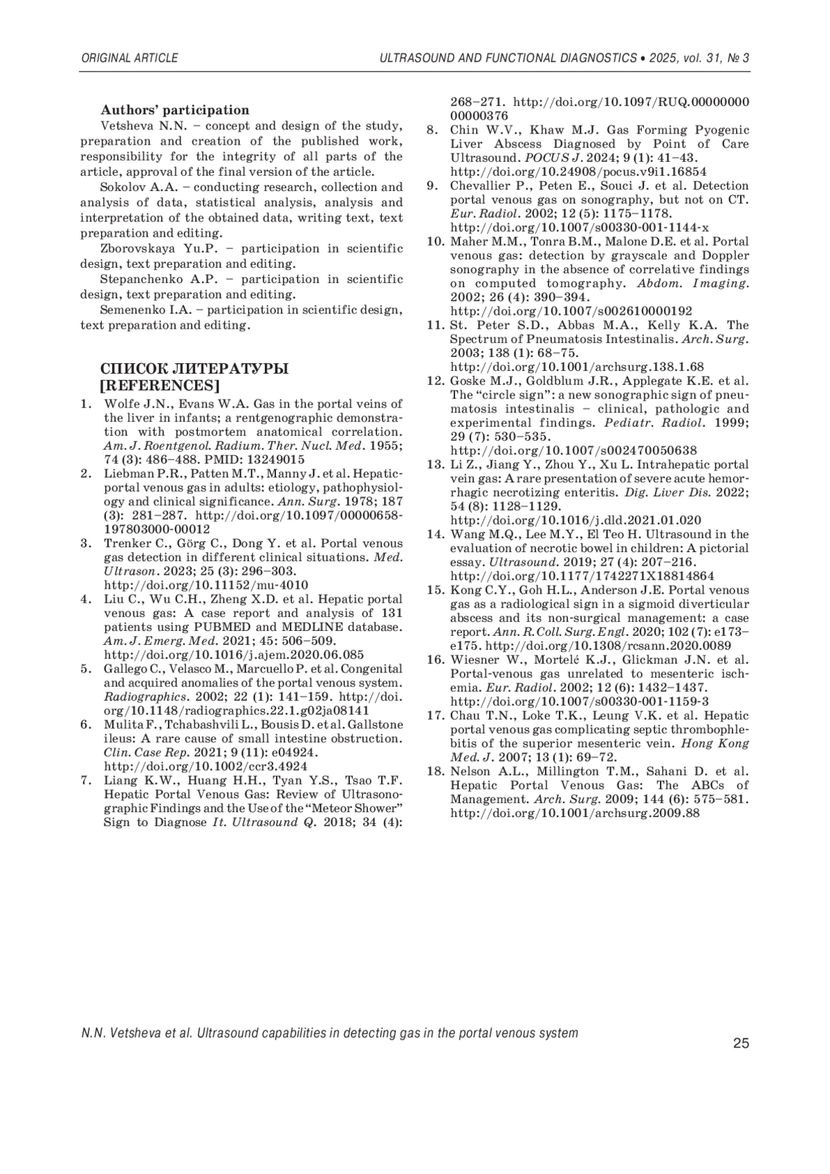 ВЕТШЕВА Н. Н., СОКОЛОВ А. А., ЗБОРОВСКАЯ Ю. П., СТЕПАНЧЕНКО А. П., СЕМЕНЕНКО И. А. ВОЗМОЖНОСТИ УЛЬТРАЗВУКОВОЙ ДИАГНОСТИКИ ГАЗА В СИСТЕМЕ ВОРОТНОЙ ВЕНЫ // УЛЬТРАЗВУКОВАЯ И ФУНКЦИОНАЛЬНАЯ ДИАГНОСТИКА. 2025. № 3, ТОМ 31