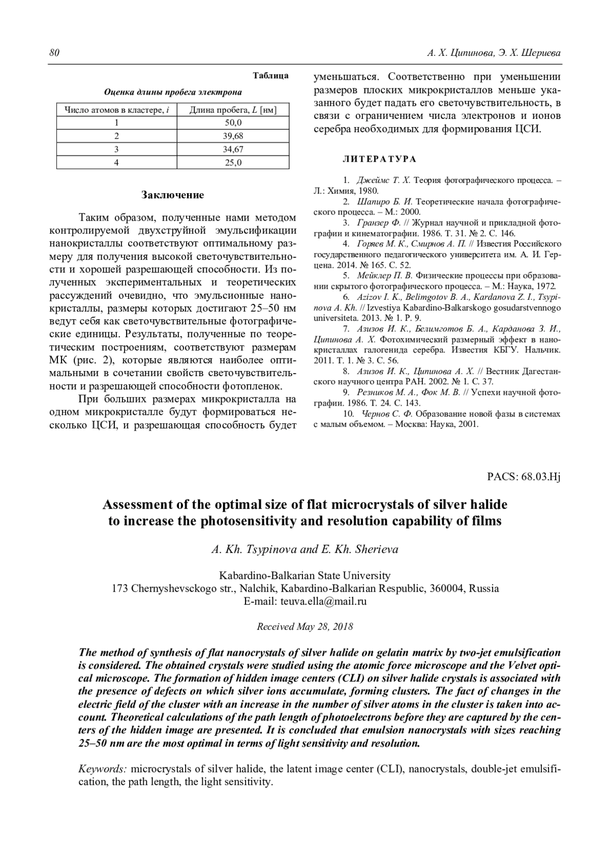 7. Азизов И. К., Белимготов Б. А., Карданова З. И., Ципинова А. Х. Фотохимический размерный эффект в нанокристаллах галогенида серебра. Известия КБГУ. Нальчик. 2011. Т. 1. № 3. С. 56.