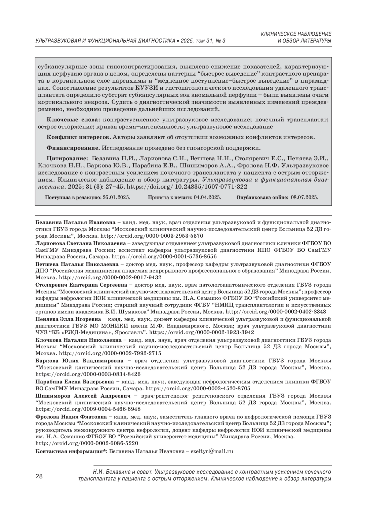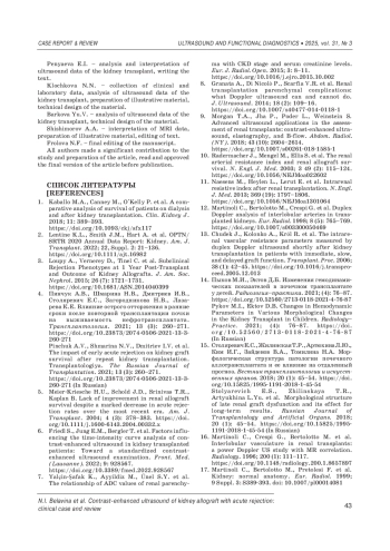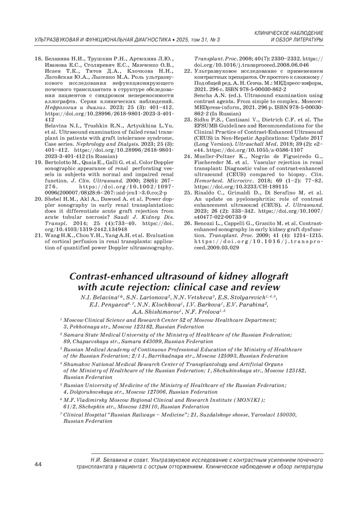 18. Белавина Н.И., Трушкин Р.Н., Артюхина Л.Ю., Иванова Е.С., Столяревич Е.С., Манченко О.В., Исаев Т.К., Титов Д.А., Клочкова Н.Н., Лагойская Ю.А., Лысенко М.А. Роль ультразвукового исследования нефункционирующего почечного трансплантата в структуре обследования пациентов с синдромом непереносимости аллографта. Серия клинических наблюдений. Нефрология и диализ. 2023; 25 (3): 401-412. DOI: 10.28996/2618-9801-2023-3-401-412