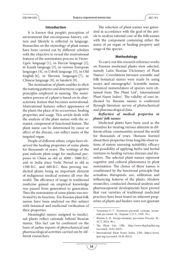 Цель. Настоящая статья посвящена изучению семантики лекарственных растений России, чьи названия указывают на их медицинские свойства и лечебные функции. Цель работы состоит в том, чтобы на основании современных фармакологических исследований растений подтвердить семантическую мотивированность названий, полученных растениями в донаучный период. Предметом исследования являются русские народные названия лечебных трав, номинация которых основывается на признаке функциональности.