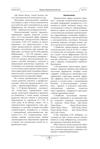 Цель. Проанализировать словообразовательные и структурные особенности производных, сложных и полилексемных терминов и выявить наиболее продуктивные способы терминообразования в сфере современного делового общения на материале английского языка.