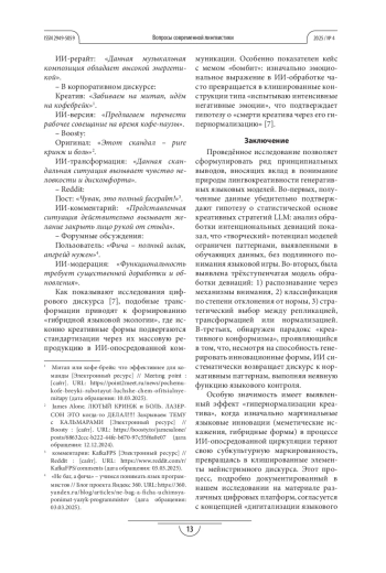 Процедура и методы. В качестве методологической базы использован комплексный подход, включающий корпусный анализ диахронического среза цифрового дискурса (2019-2024 гг.), экспериментальные промпты с контролируемыми девиациями для моделей GPT-4, Gemini 1.5 и Claude 3, а также дискурс-анализ речевых актов ИИ с применением трёхуровневой шкалы аннотирования (репликация/амплификация/нормализация).