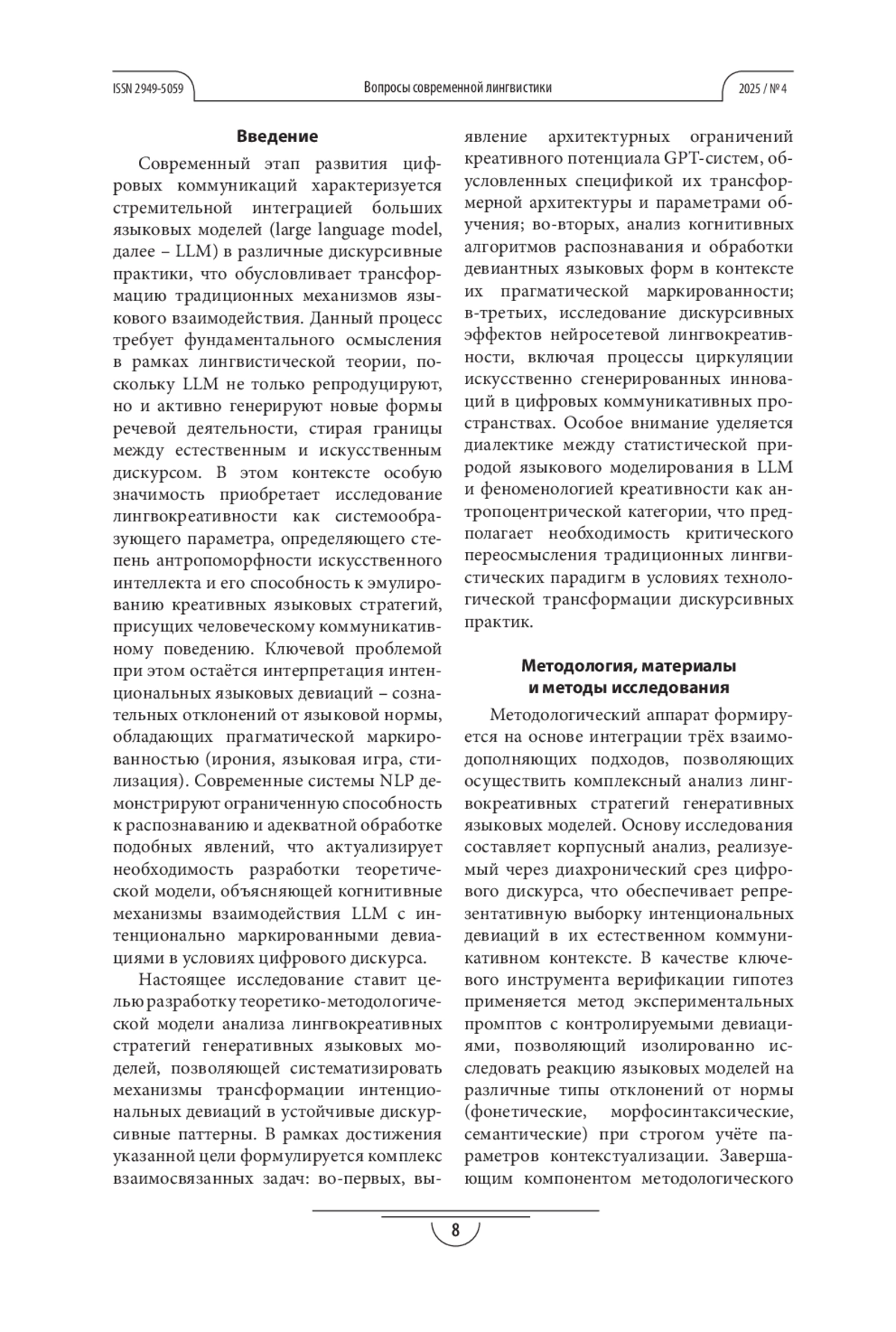 Цель. Настоящее исследование направлено на выявление механизмов обработки интенциональных языковых девиаций большими языковыми моделями (LLM) и анализ их лингво-креативных стратегий в цифровом дискурсе. Цель работы заключается в разработке теоретической модели, объясняющей когнитивные алгоритмы распознавания и трансформации девиаций в системах искусственного интеллекта.