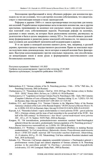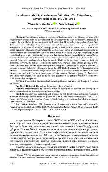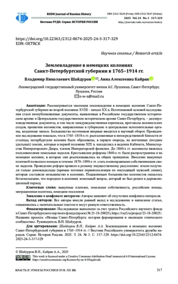 3. Кайряк А.А. Немецкие колонии и вопрос землевладения во второй половине XVIII - первой половине XIX в. // Общество и власть России в период модернизации второй половины XIX-XX века. Тамбов: ТГТУ, 2024. С. 67-74. EDN: GPSVNS