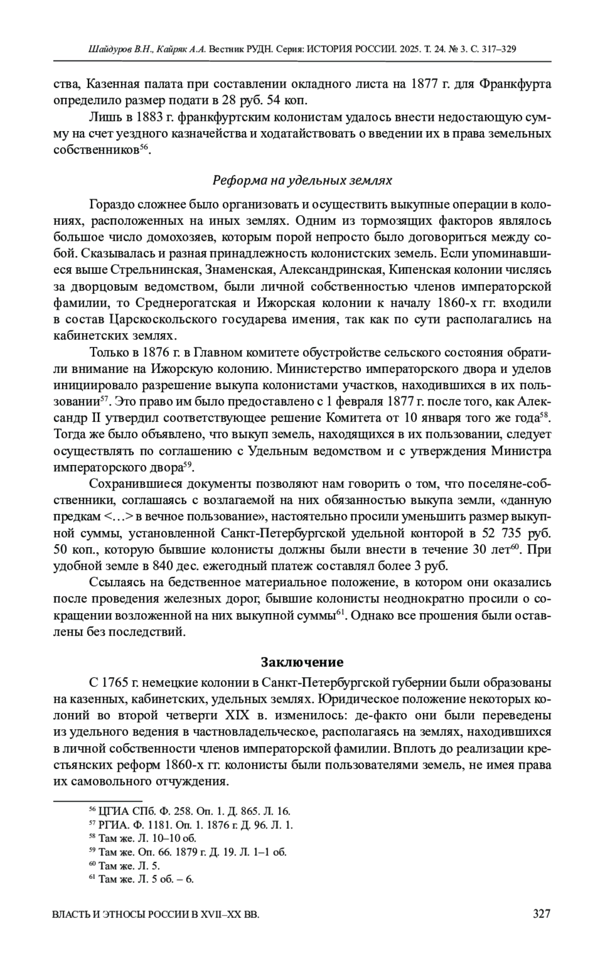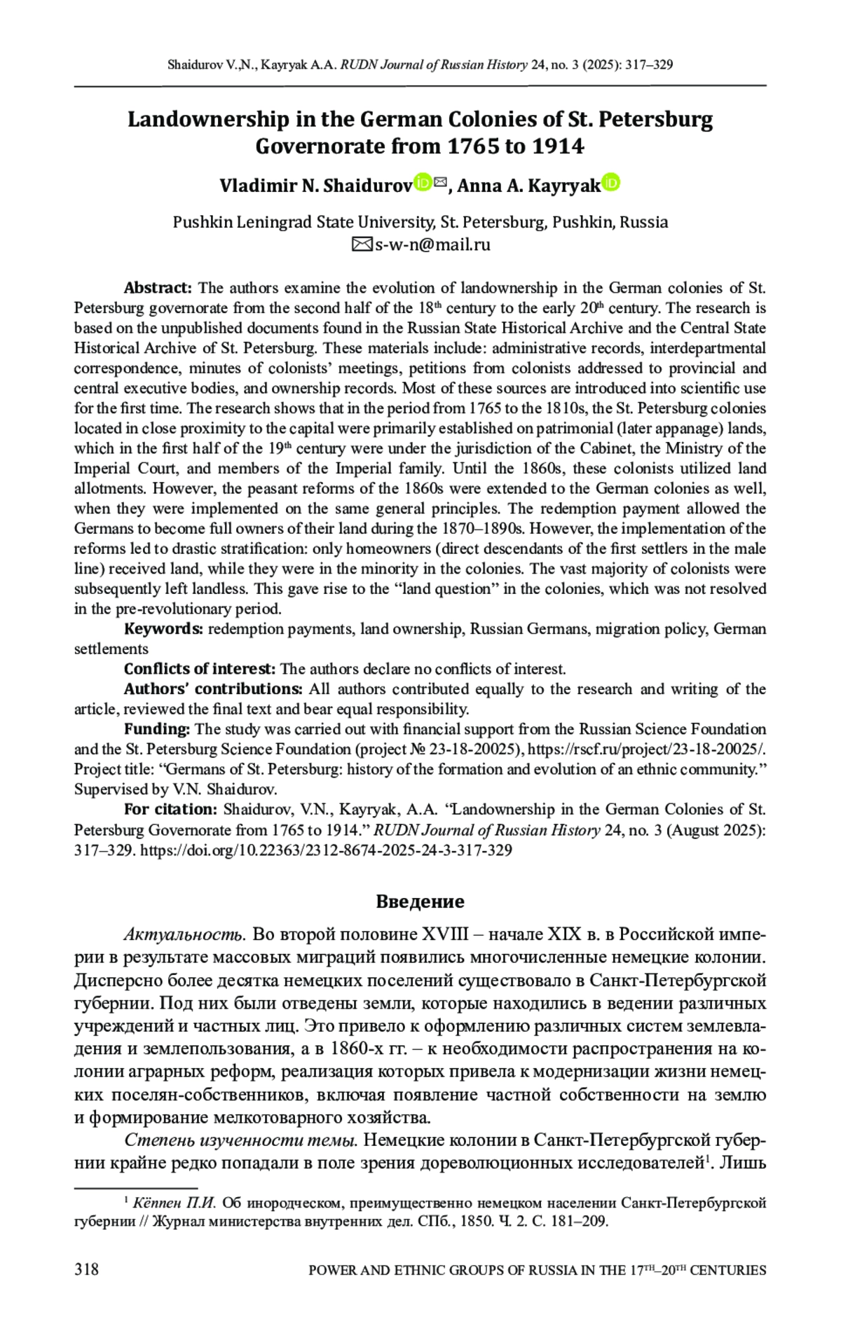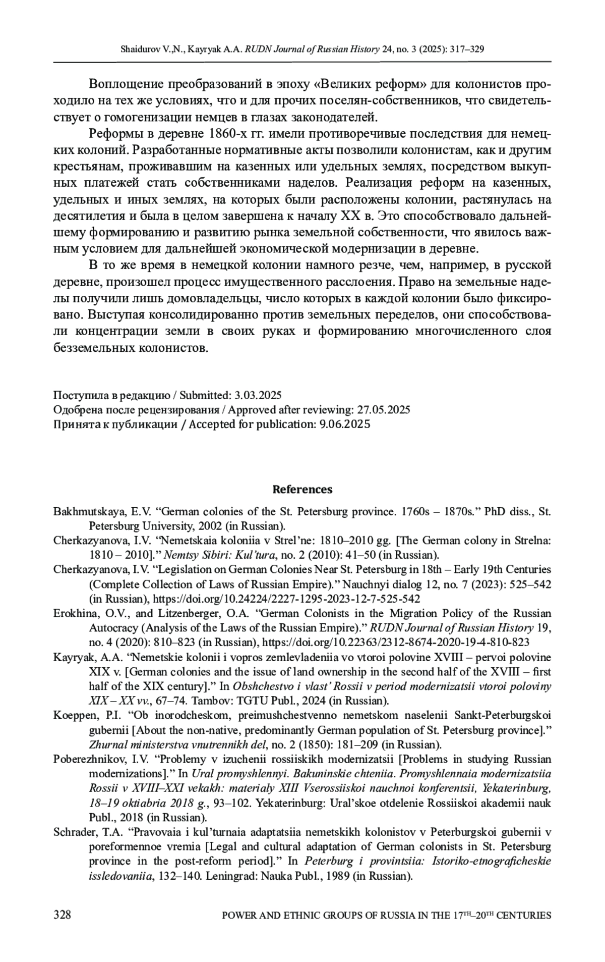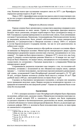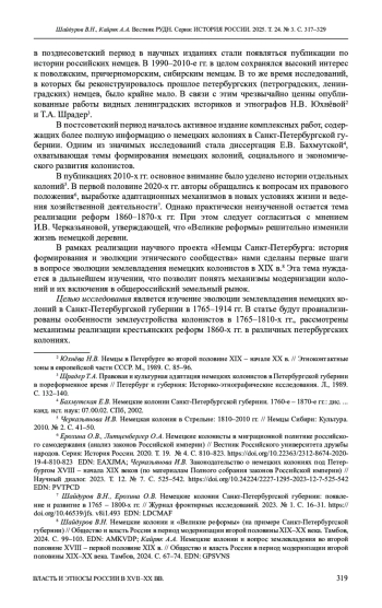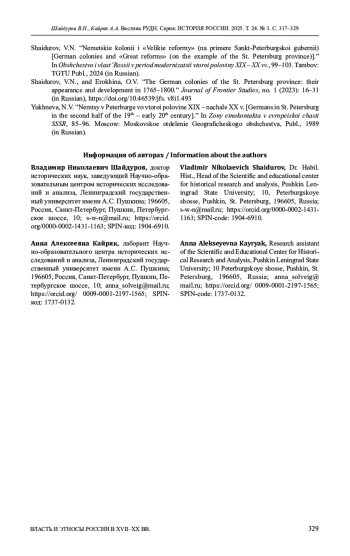 9. Шайдуров В.Н. Немецкие колонии и “Великие реформы” (на примере Санкт-Петербургской губернии) // Общество и власть России в период модернизации второй половины XIX-XX века. Тамбов: ТГТУ, 2024. С. 99-103. EDN: AMKVDP