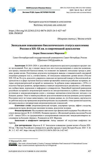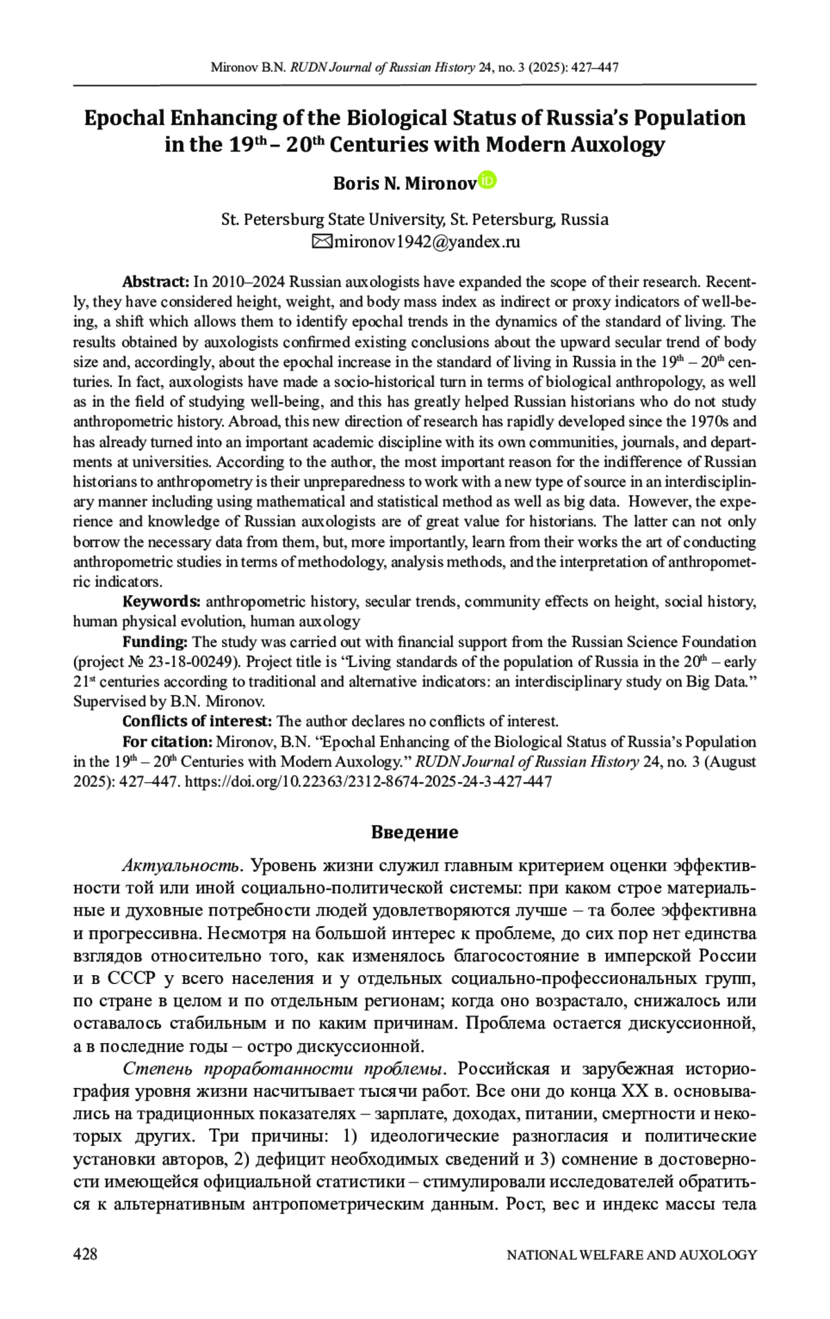 24. Миронов Б.Н. Благосостояние населения и революции в имперской России: XVIII - начало ХХ века. М.: Весь мир, 2010. 844 с. EDN: QBREIX