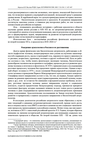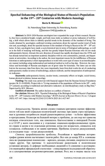 В 2010-2024 гг. российские антропологи-ауксологи расширили предмет своих исследований. Рост, вес и индекс массы тела они стали рассматривать в качестве косвенных, или прокси, показателей благосостояния, что позволяет им выявлять эпохальные тренды в динамике уровня жизни. Полученные результаты подтвердили выводы о повышательной секулярной тенденции размеров тела и, соответственно, об эпохальном повышении уровня жизни в России XIX-ХХ вв. По сути, ауксологи совершили социально-исторический поворот в биологической антропологии и в сфере изучения благосостояния чрезвычайно помогли российским историкам, которые антропометрической историей не занимаются. За рубежом новое направление с 1970х гг. получило быстрое развитие, превратившись в важную академическую дисциплину с собственными сообществами, журналами и кафедрами в университетах. Важнейшей причиной равнодушия российских историков к антропометрии является их неподготовленность к работе с новым видом источников в междисциплинарном ключе с помощью математико-статистических методов и на больших данных. Опыт и знания российских ауксологов являются весьма ценными для историков. Последние могут не только заимствовать у них нужные данные, но, что более важно, научиться по их работам искусству проведения антропометрических исследований с точки зрения методологии, методики анализа и интерпретации антропометрических показателей.