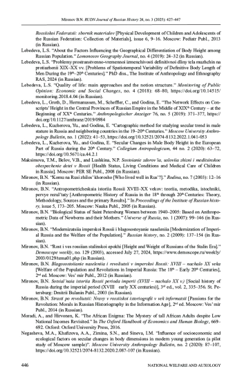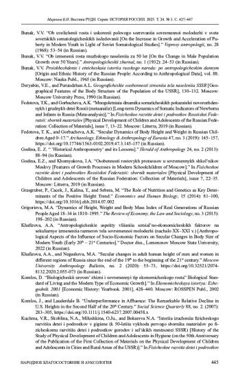 42. Lebedeva L., Kucherova Yu., Godina E. Secular Changes in Male Body Height in the European Part of Russia during the 20th Century // Collegium Antropologicum. 2020. №. 44 (2). P. 63-72. DOI: 10.5671/ca.44.2.1 EDN: TNSVQZ