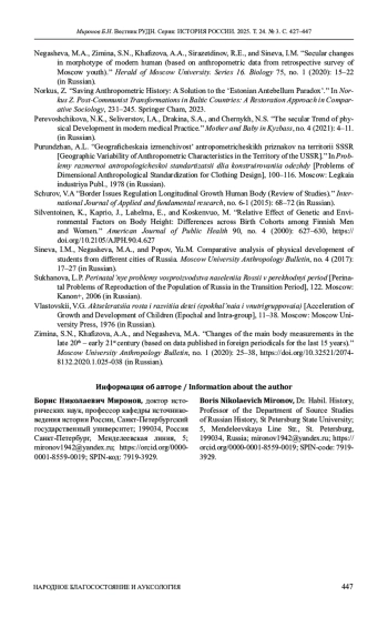 35. Хафизова А. А., Негашева М. А. Секулярные изменения дефинитивной длины тела мужчин и женщин разных регионов России (конец XIX - начало XXI в.) // Вестник Московского университета. Сер. 23: Антропология. 2020. № 2. С. 55-73. DOI: 10.32521/2074-8132.2020.2.055-073 EDN: PTWKKH