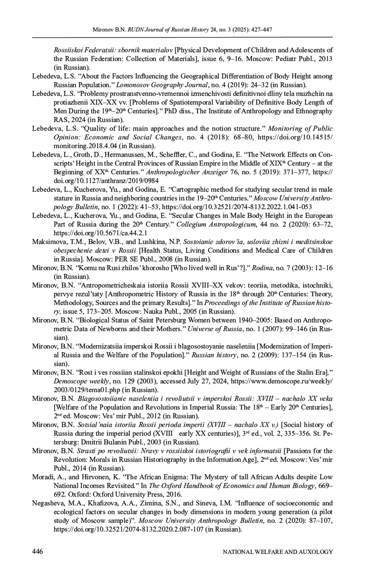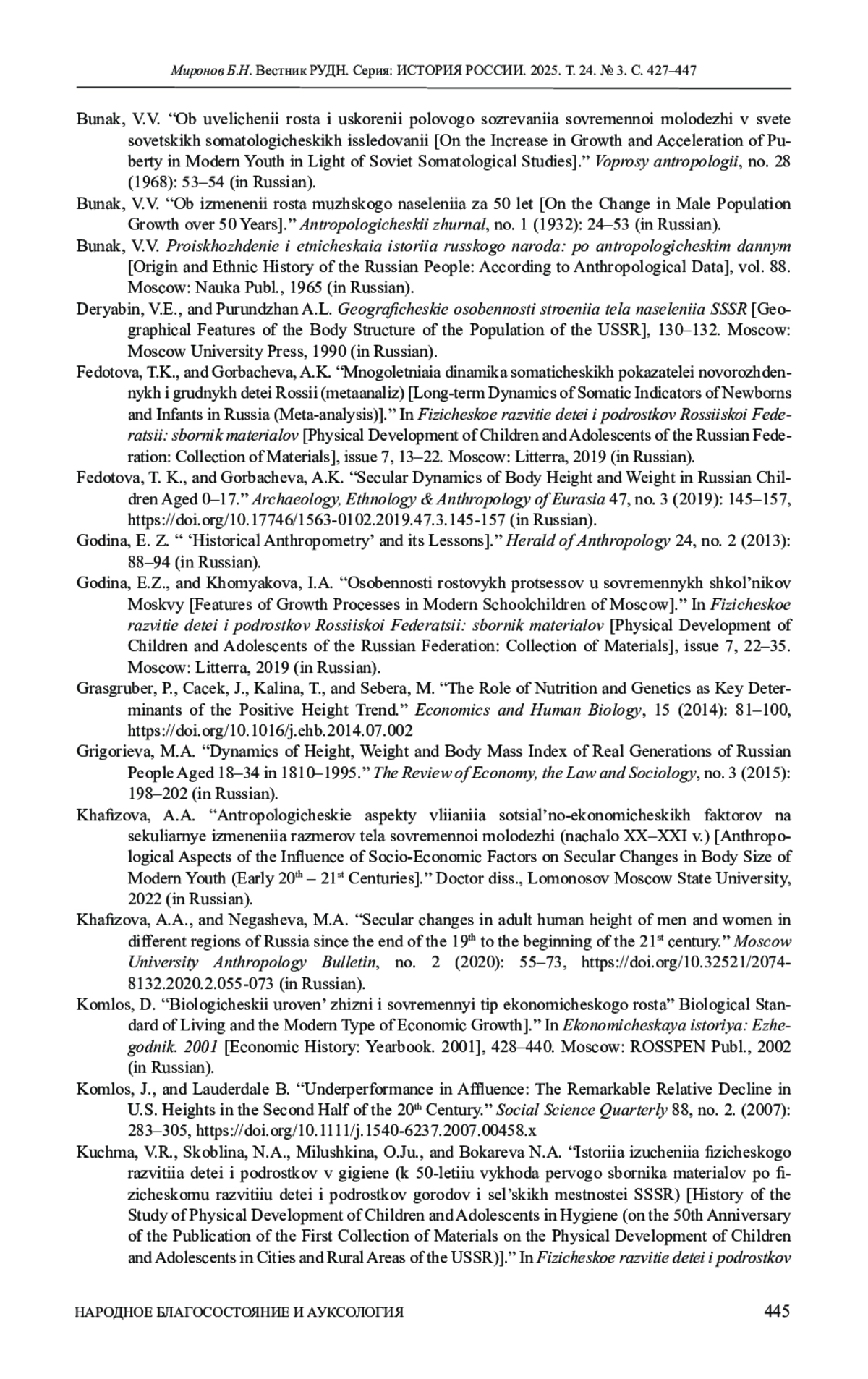 19. Миронов Б.Н. Рост и вес россиян сталинской эпохи // Демоскоп. 2003. № 129. URL: https://www.demoscope.ru/week-ly/2003/0129/tema01.php.