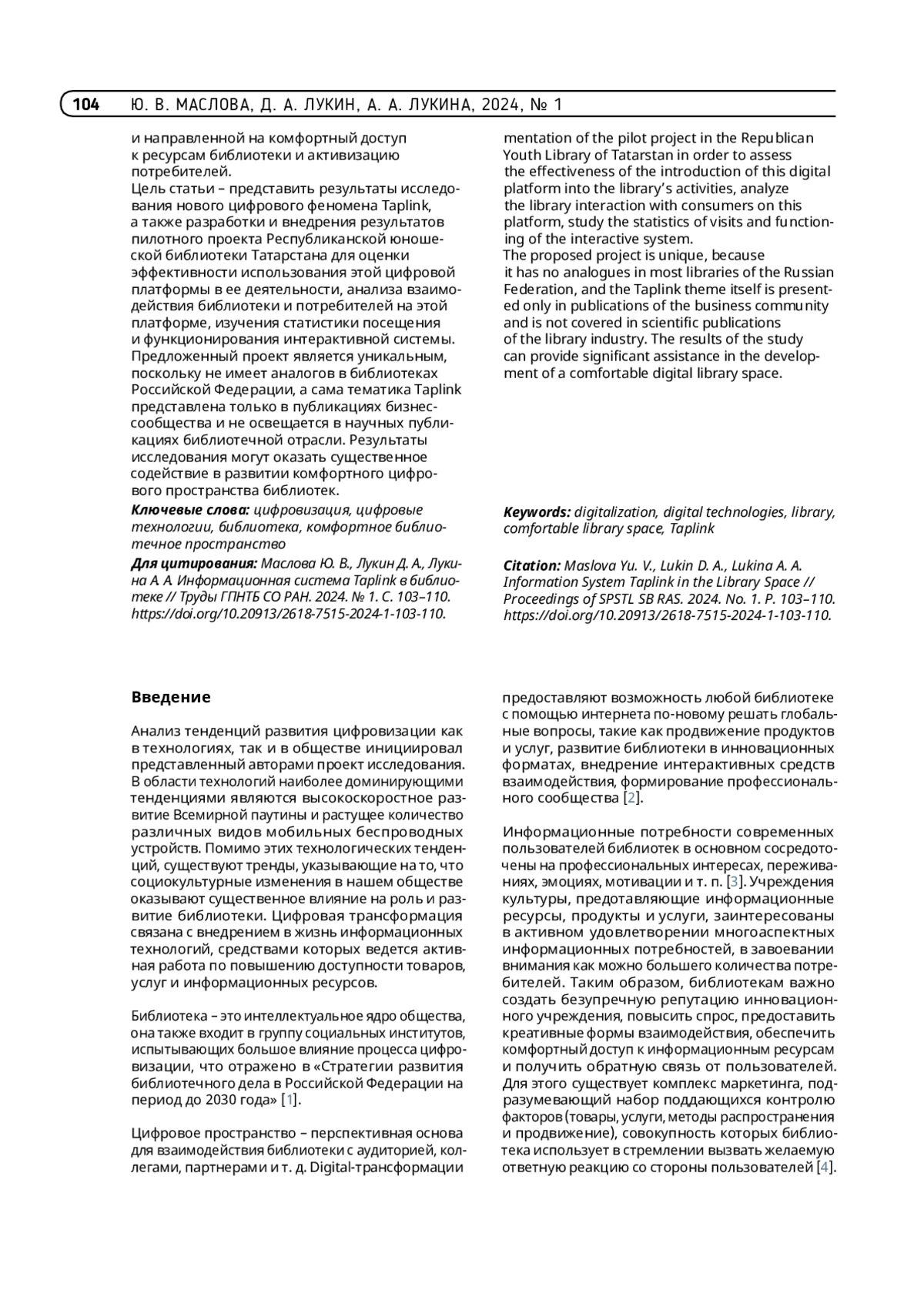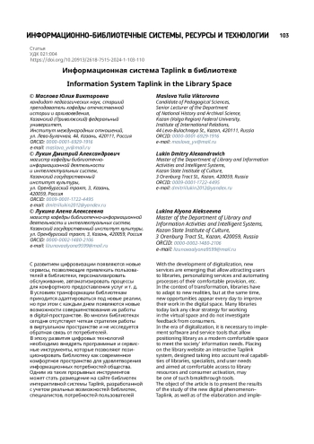 МАСЛОВА Ю. В., ЛУКИН Д. А., ЛУКИНА А. А. ИНФОРМАЦИОННАЯ СИСТЕМА TAPLINK В БИБЛИОТЕКЕ // ТРУДЫ ГПНТБ СО РАН. 2024. № 1