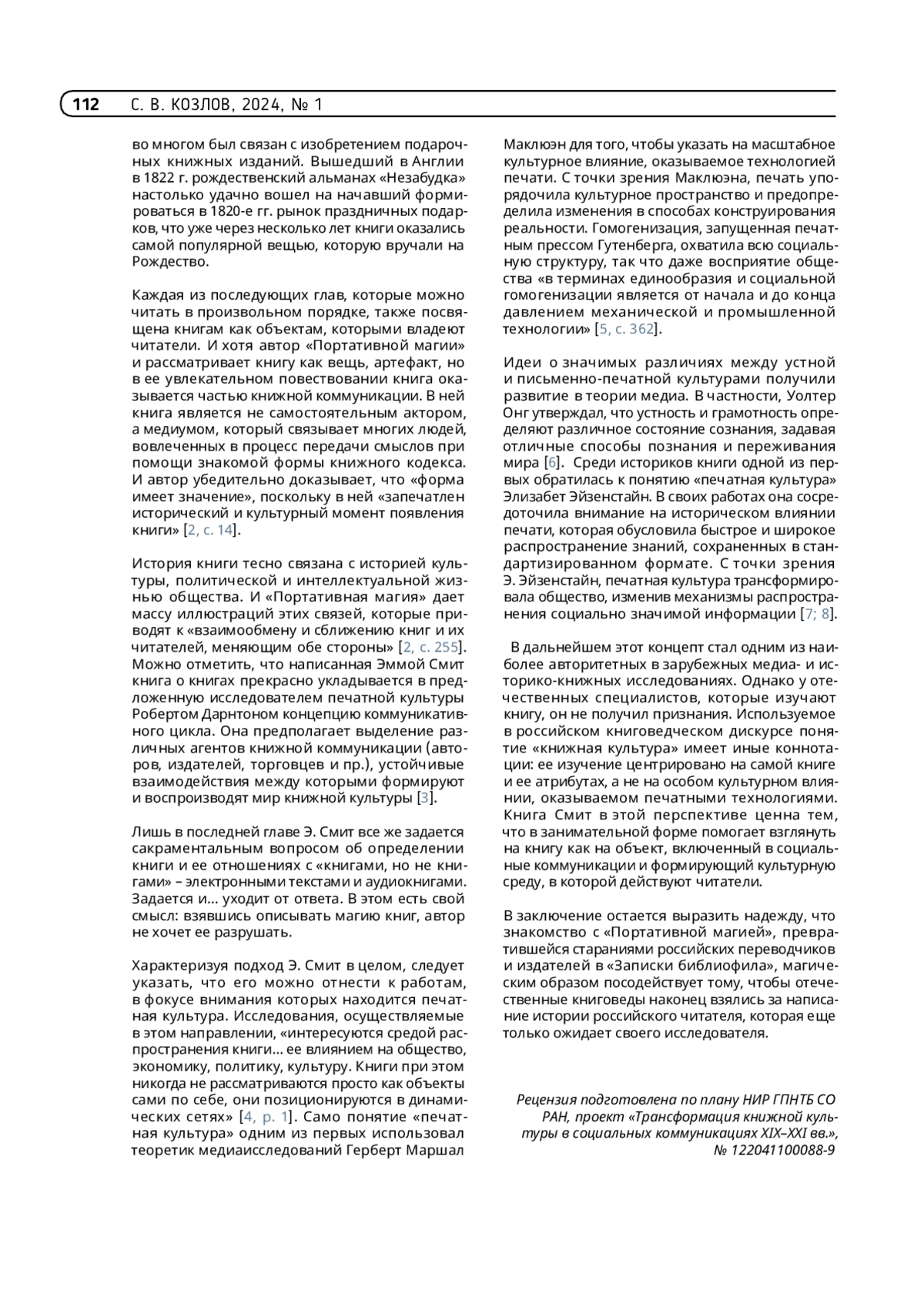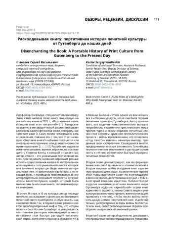 КОЗЛОВ С. В. РАСКОЛДОВЫВАЯ КНИГУ: ПОРТАТИВНАЯ ИСТОРИЯ ПЕЧАТНОЙ КУЛЬТУРЫ ОТ ГУТЕНБЕРГА ДО НАШИХ ДНЕЙ // ТРУДЫ ГПНТБ СО РАН. 2024. № 1