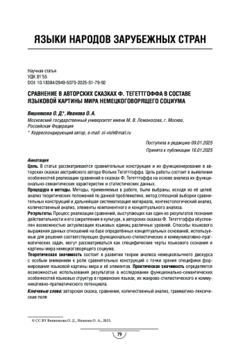 Цель. В статье рассматриваются сравнительные конструкции и их функционирование в авторских сказках австрийского автора Фольке Тегеттгоффа. Цель работы состоит в выявлении особенностей реализации сравнений в сказках Ф. Тегеттгоффа на основе анализа их функционально-семантических характеристик и статистических данных.