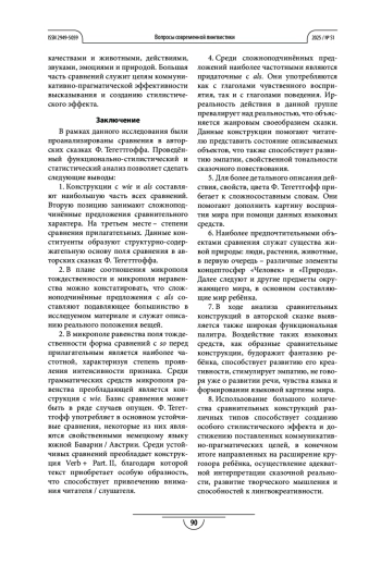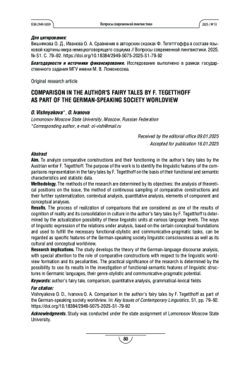 Результаты. Процесс реализации сравнений, выступающих как один из результатов познания действительности и его закрепления в культуре, в авторских сказках Ф. Тегеттгоффа обусловлен возможностью актуализации языковых единиц различных уровней. Способы языкового выражения данных отношений на базе определённых концептуальных оснований, используемые для решения соответствующих функционально-стилистических и коммуникативно-прагматических задач, могут рассматриваться как специфические черты языкового сознания и картины мира немецкоговорящего социума.